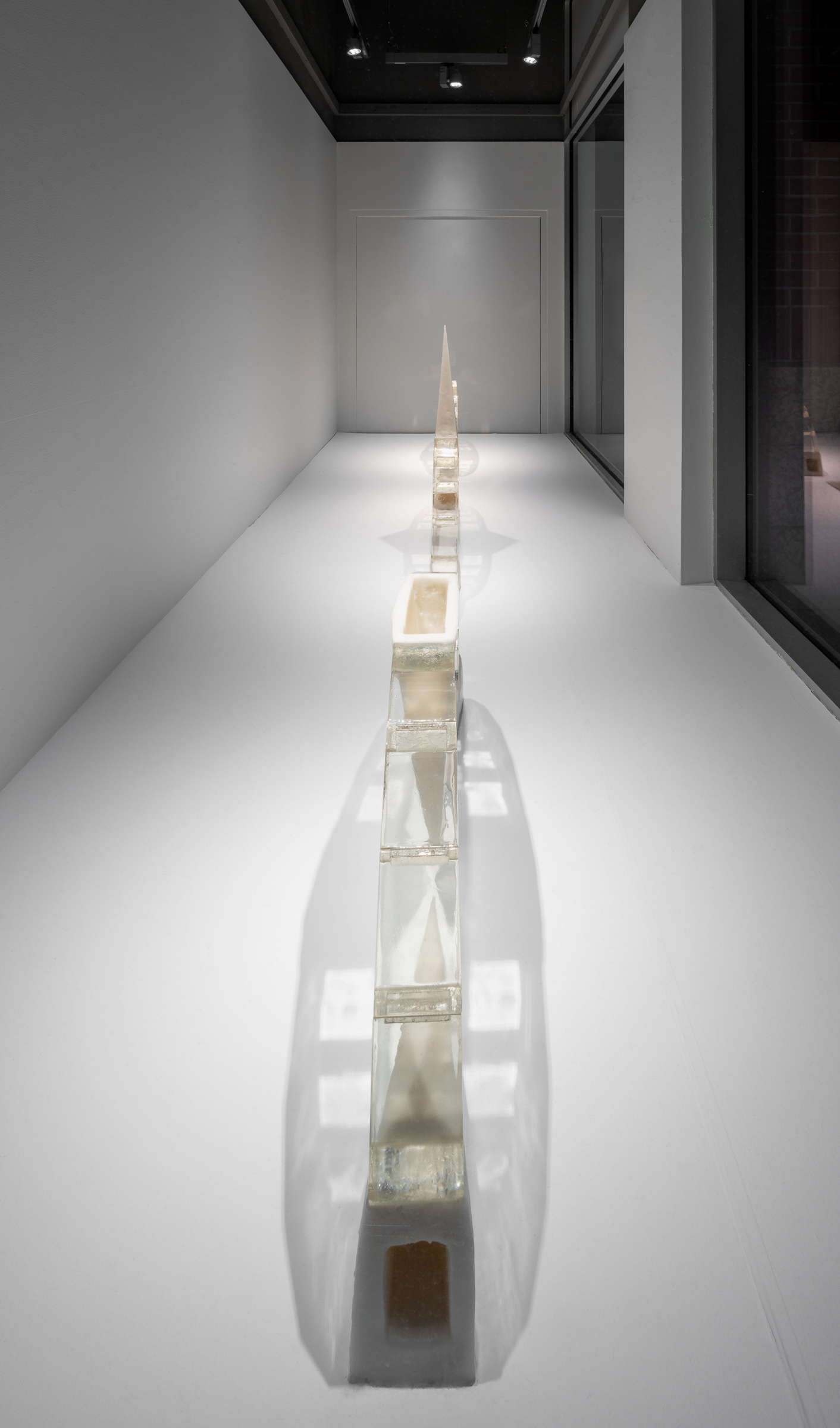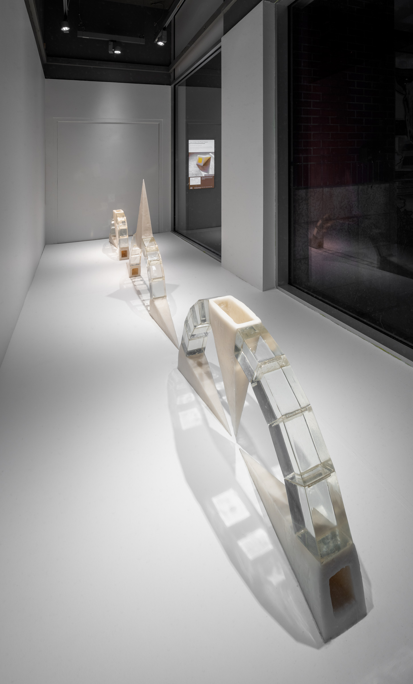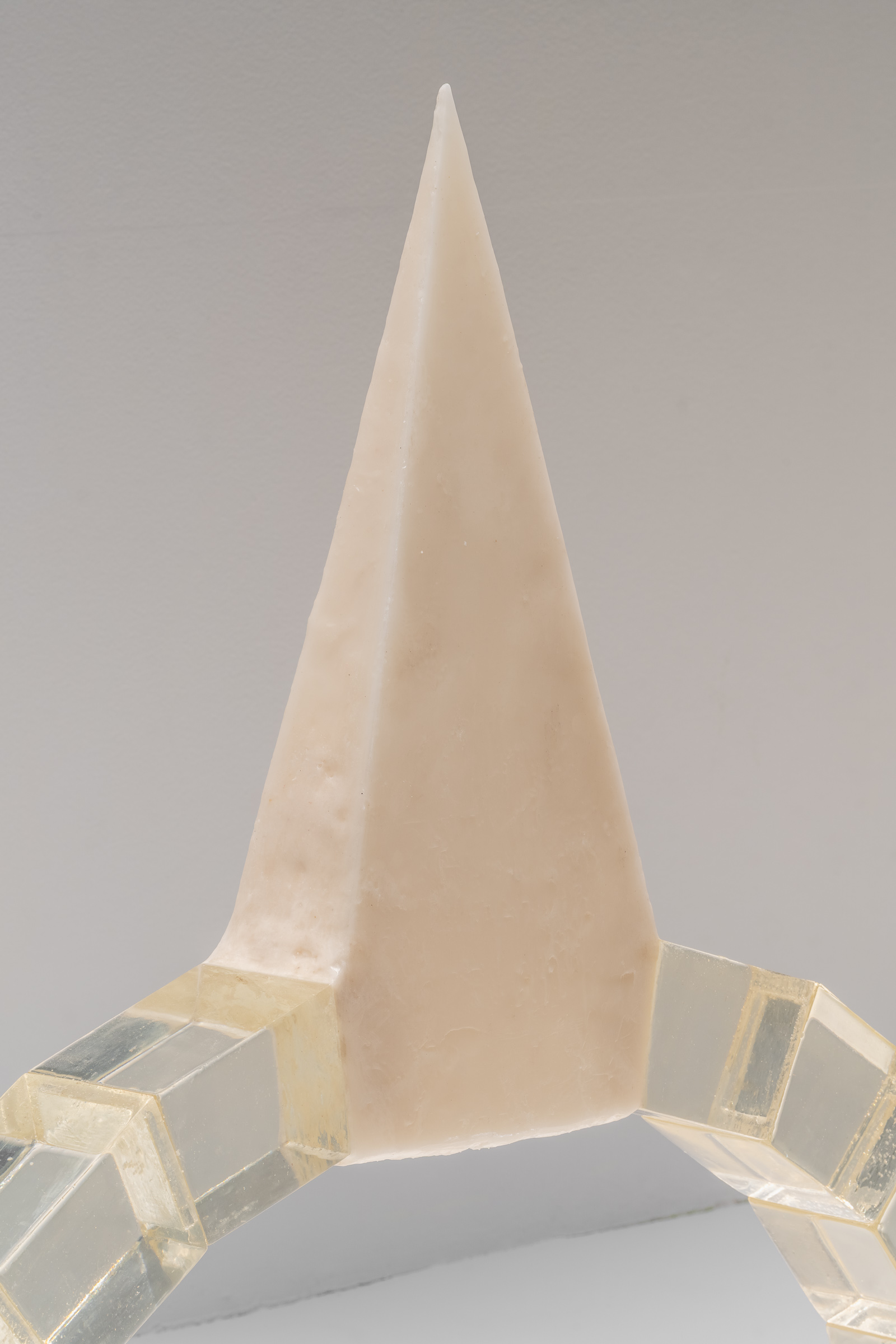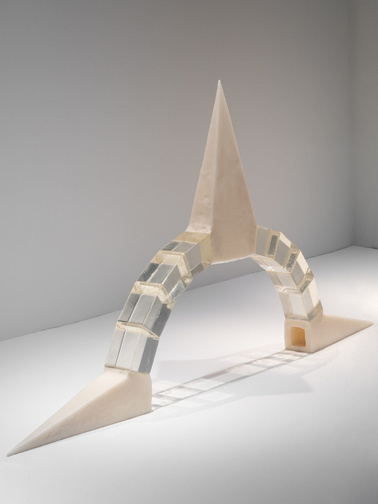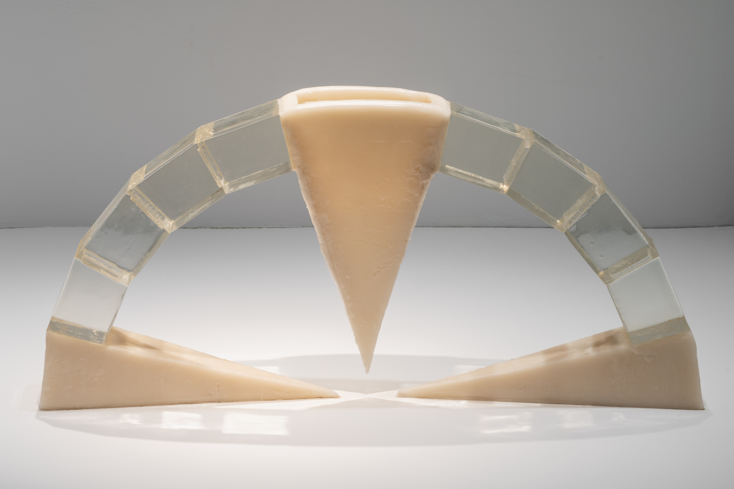 Semenoff’s series of three self-supporting arches unfold in sequence, creating a succession of portals or thresholds in space. Each arch consists of a series of transparent resin blocks, which have been cast into interlocking forms. Hollow beeswax pyramids form the keystone and base of each arch. In keeping with Semenoff’s architectural reference point, the structural integrity of the arches is entirely self-evident. Gravity, geometry, and compression hold the form together; nothing is hidden.