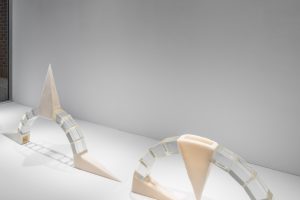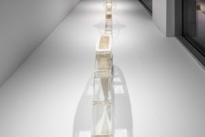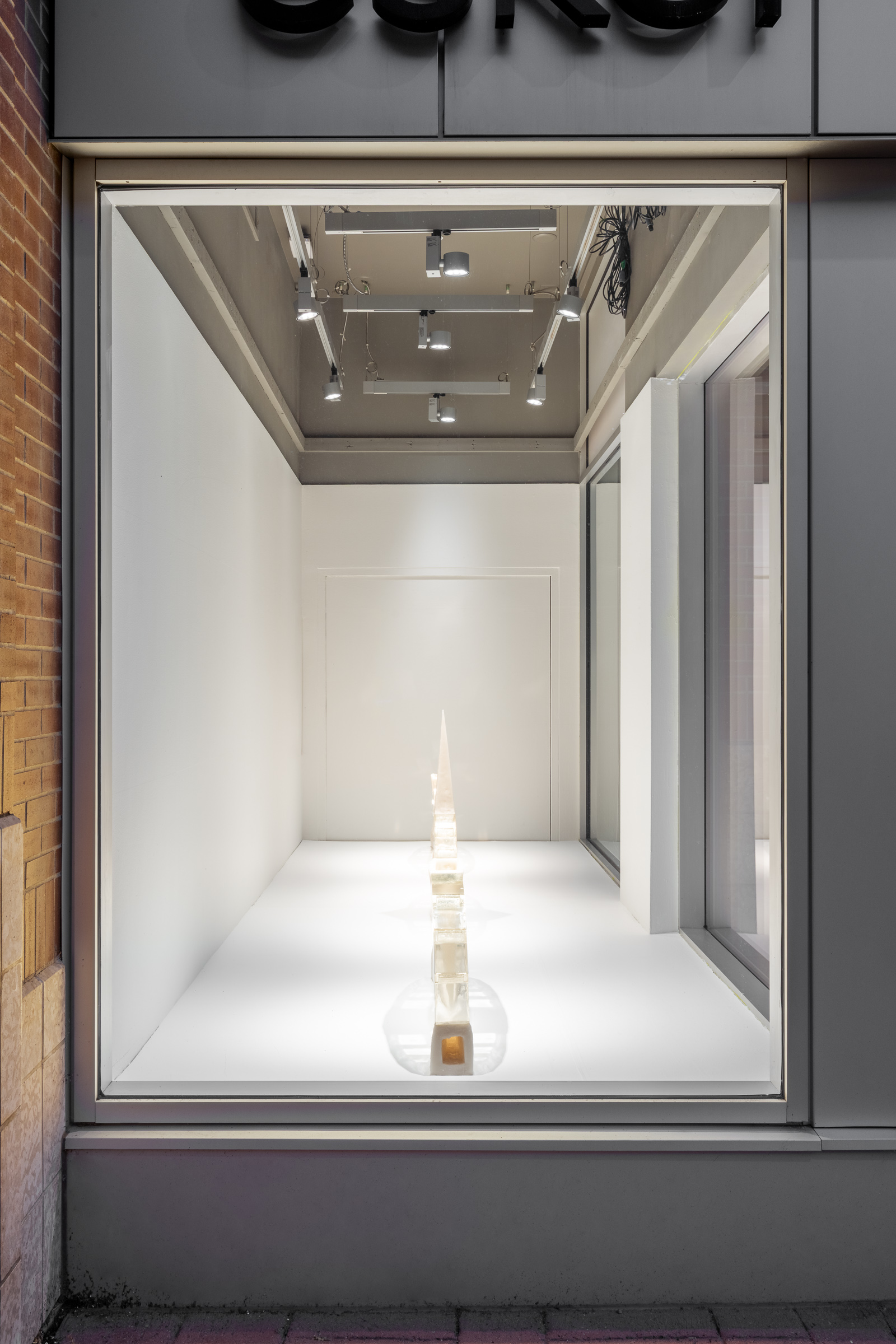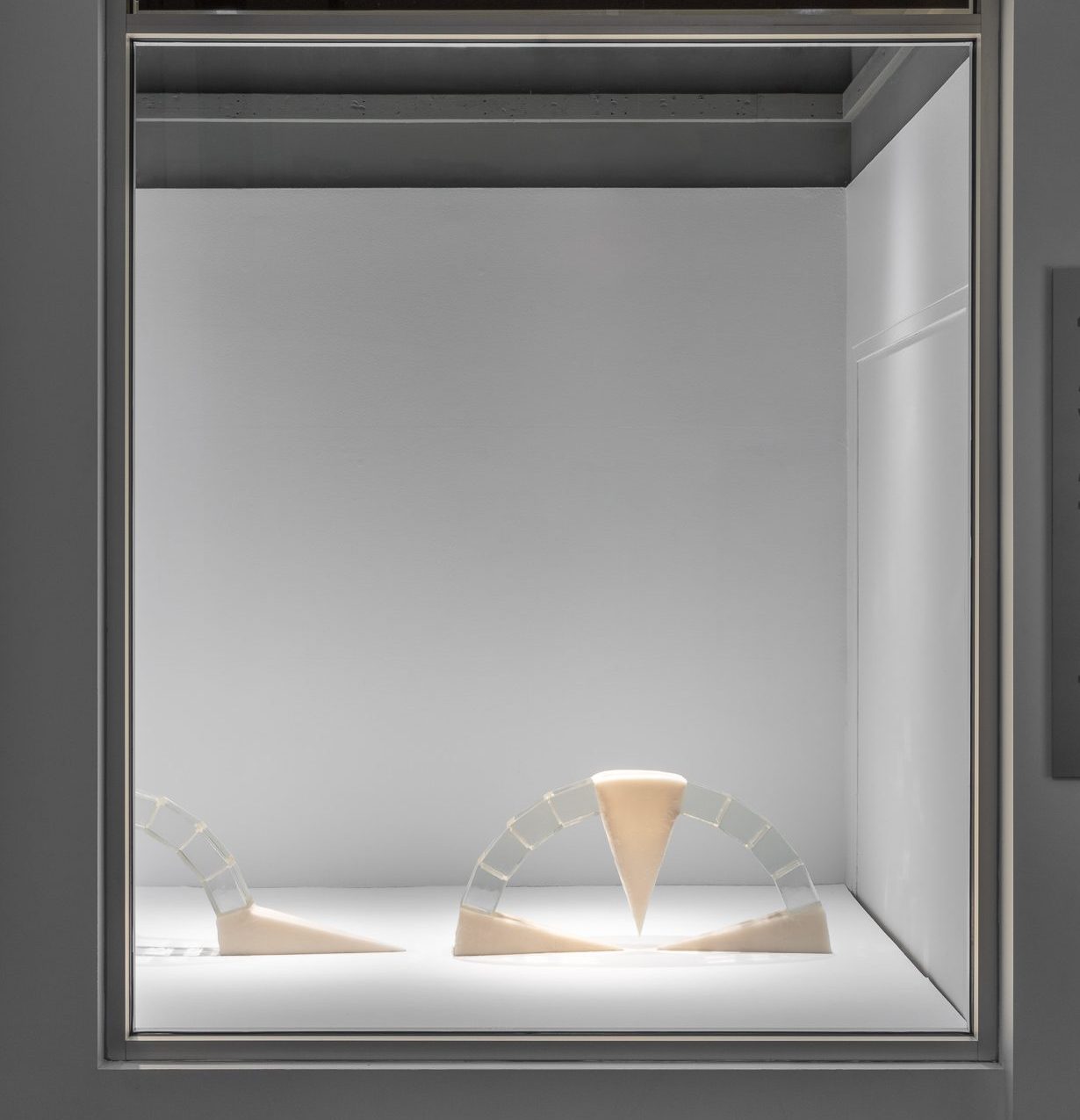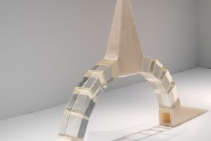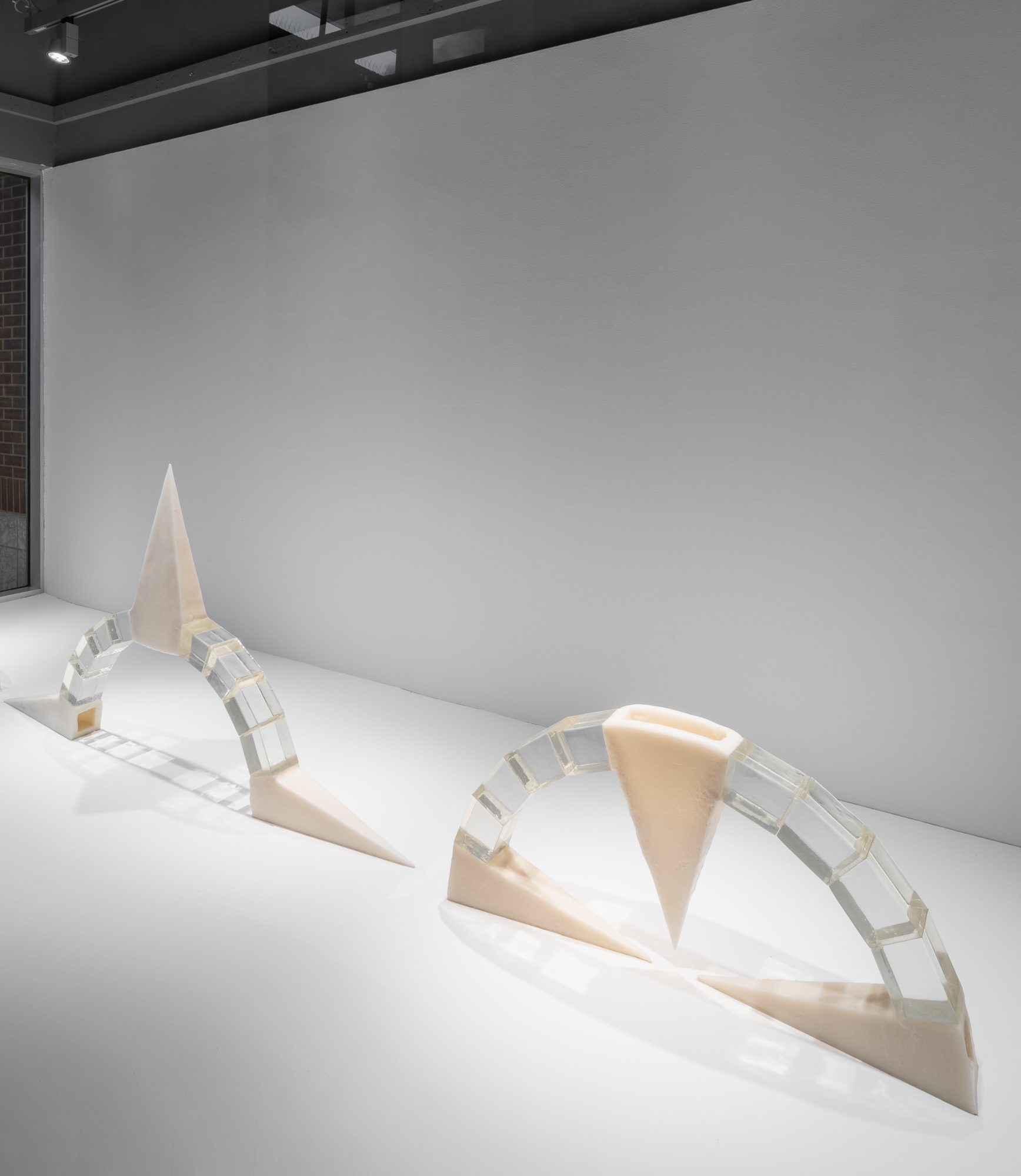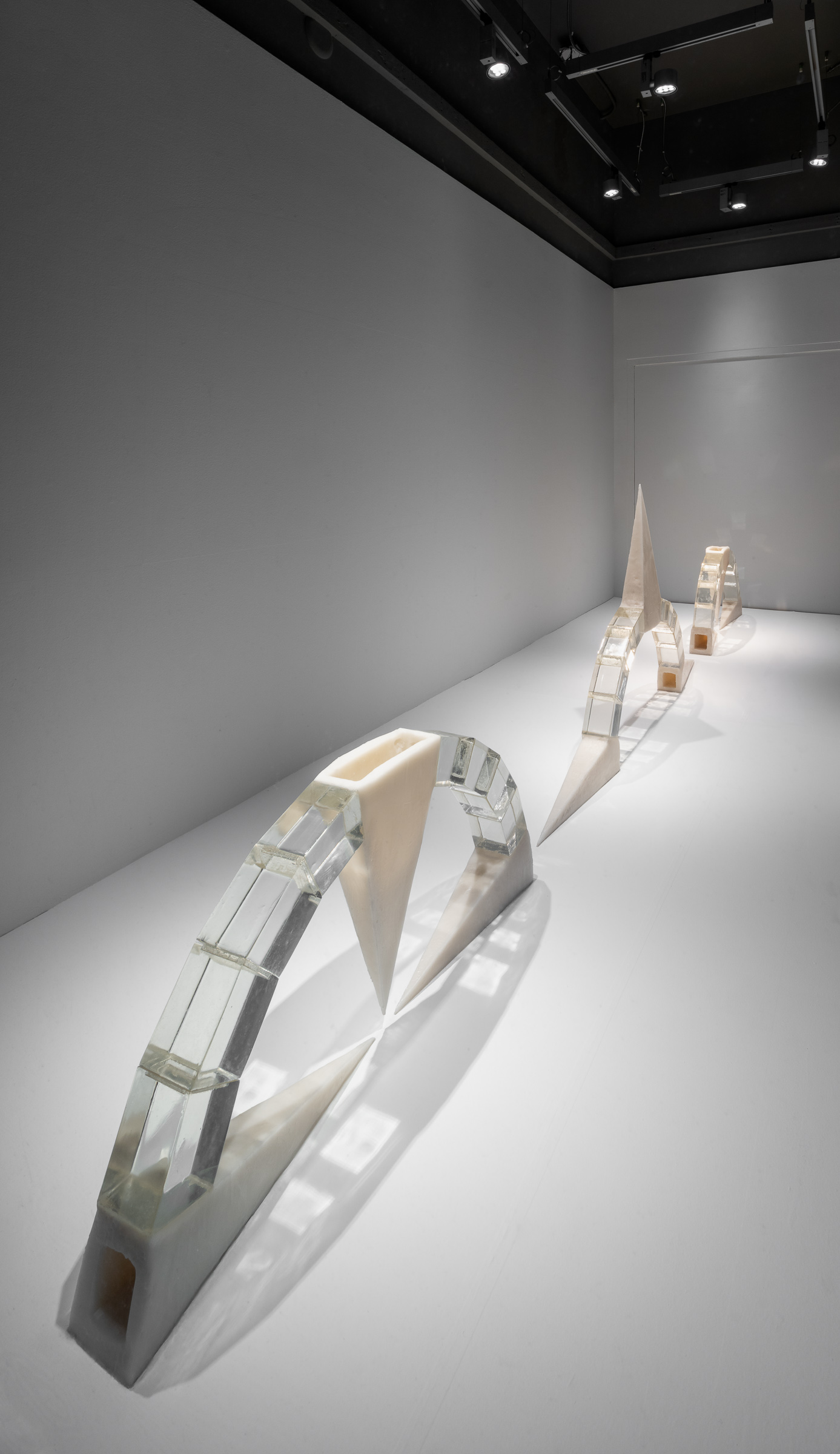 Semenoff’s series of three self-supporting arches unfold in sequence, creating a succession of portals or thresholds in space. Each arch consists of a series of transparent resin blocks, which have been cast into interlocking forms. Hollow beeswax pyramids form the keystone and base of each arch. In keeping with Semenoff’s architectural reference point, the structural integrity of the arches is entirely self-evident. Gravity, geometry, and compression hold the form together; nothing is hidden.