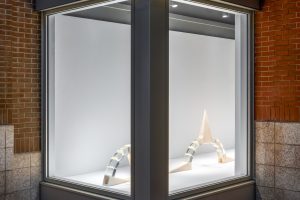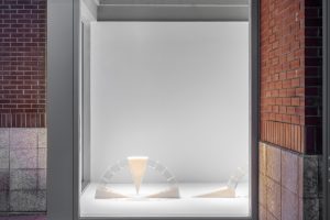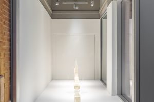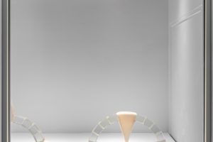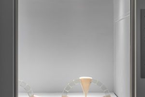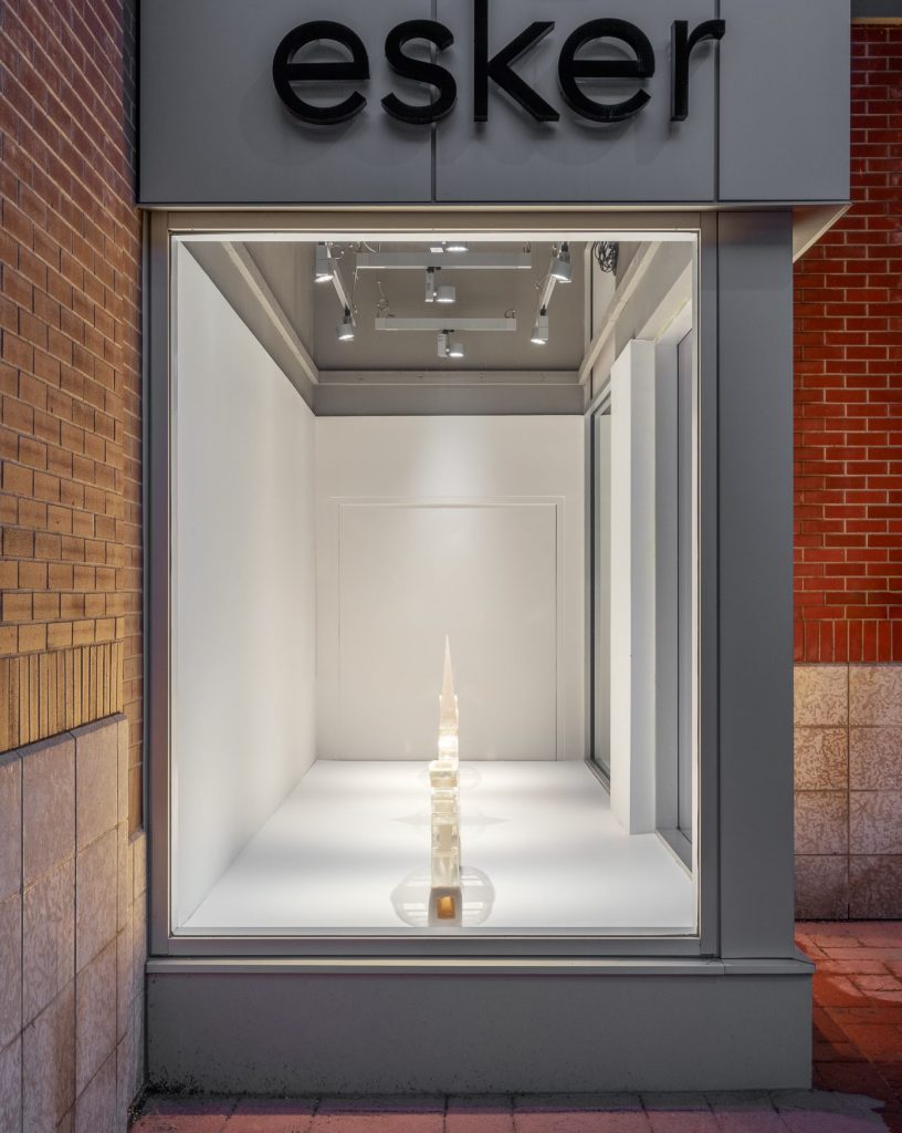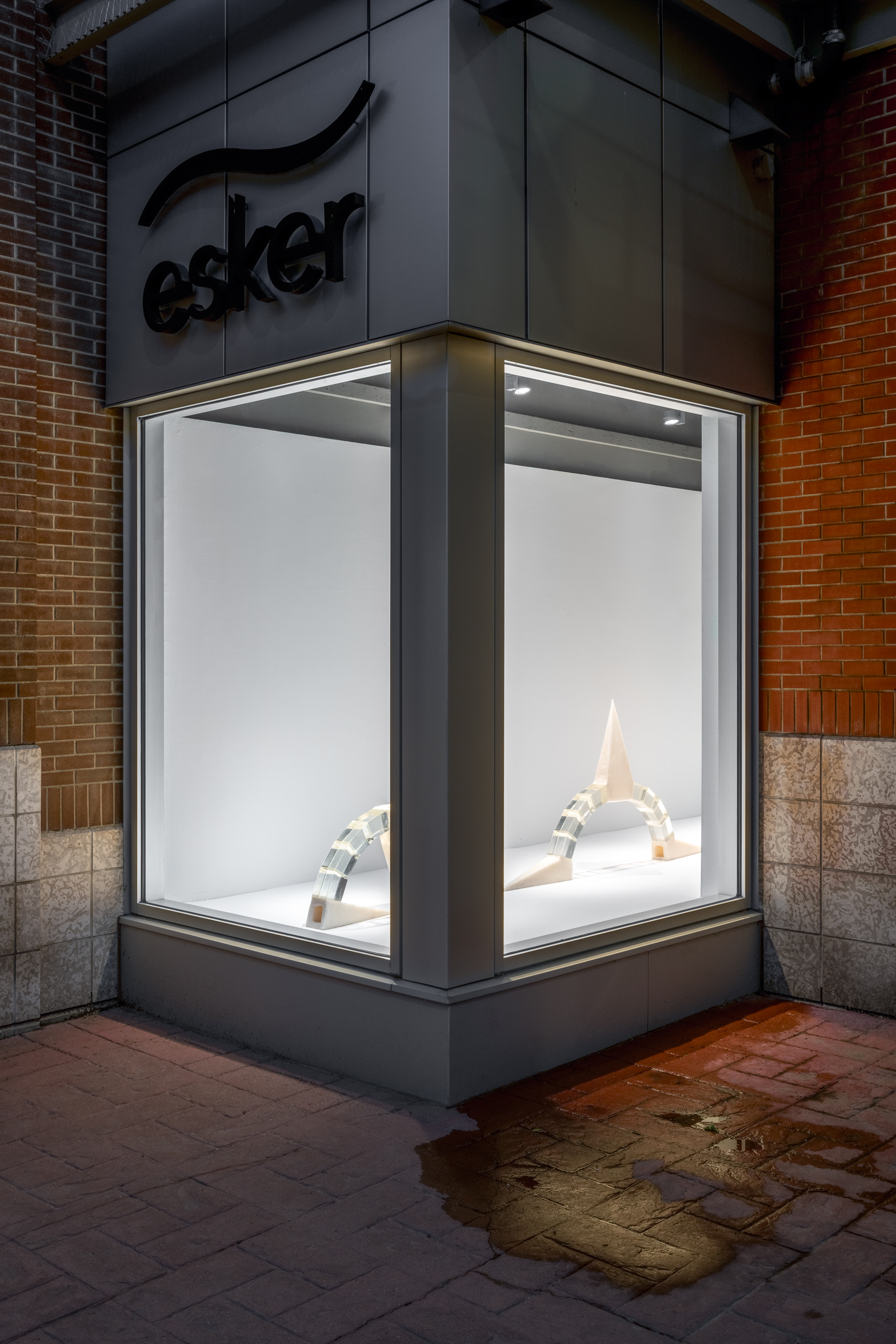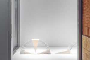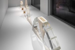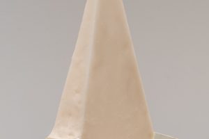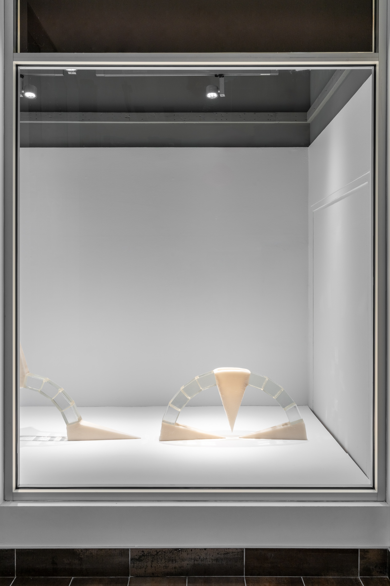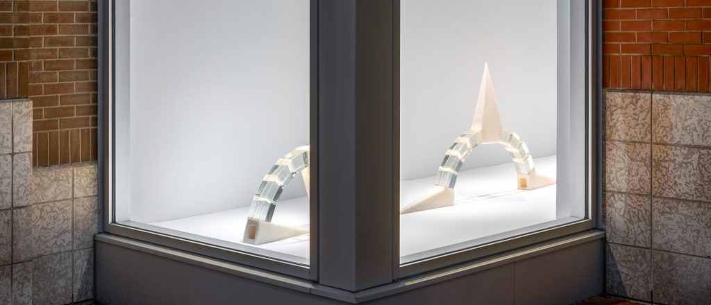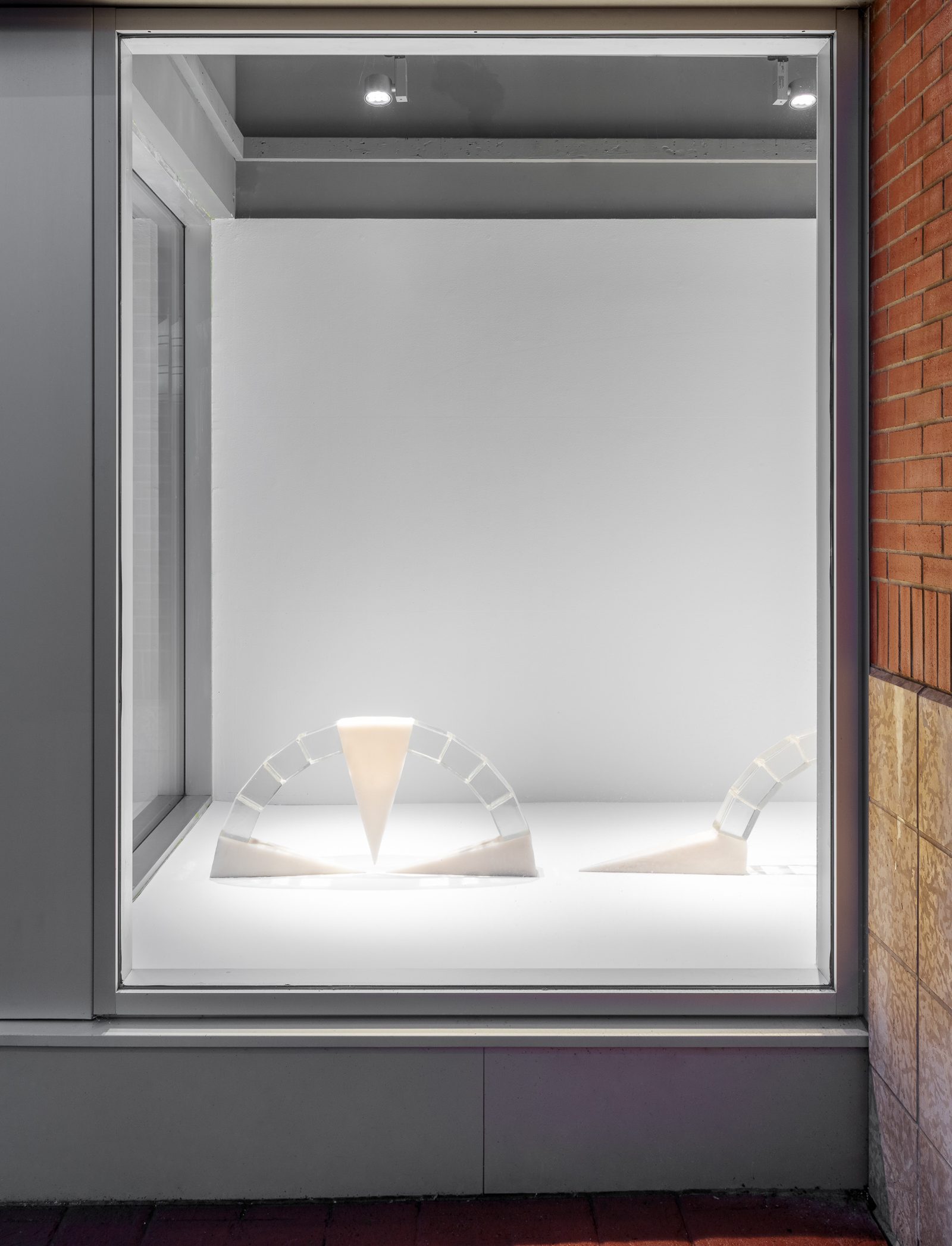 Semenoff’s series of three self-supporting arches unfold in sequence, creating a succession of portals or thresholds in space. Each arch consists of a series of transparent resin blocks, which have been cast into interlocking forms. Hollow beeswax pyramids form the keystone and base of each arch. In keeping with Semenoff’s architectural reference point, the structural integrity of the arches is entirely self-evident. Gravity, geometry, and compression hold the form together; nothing is hidden.