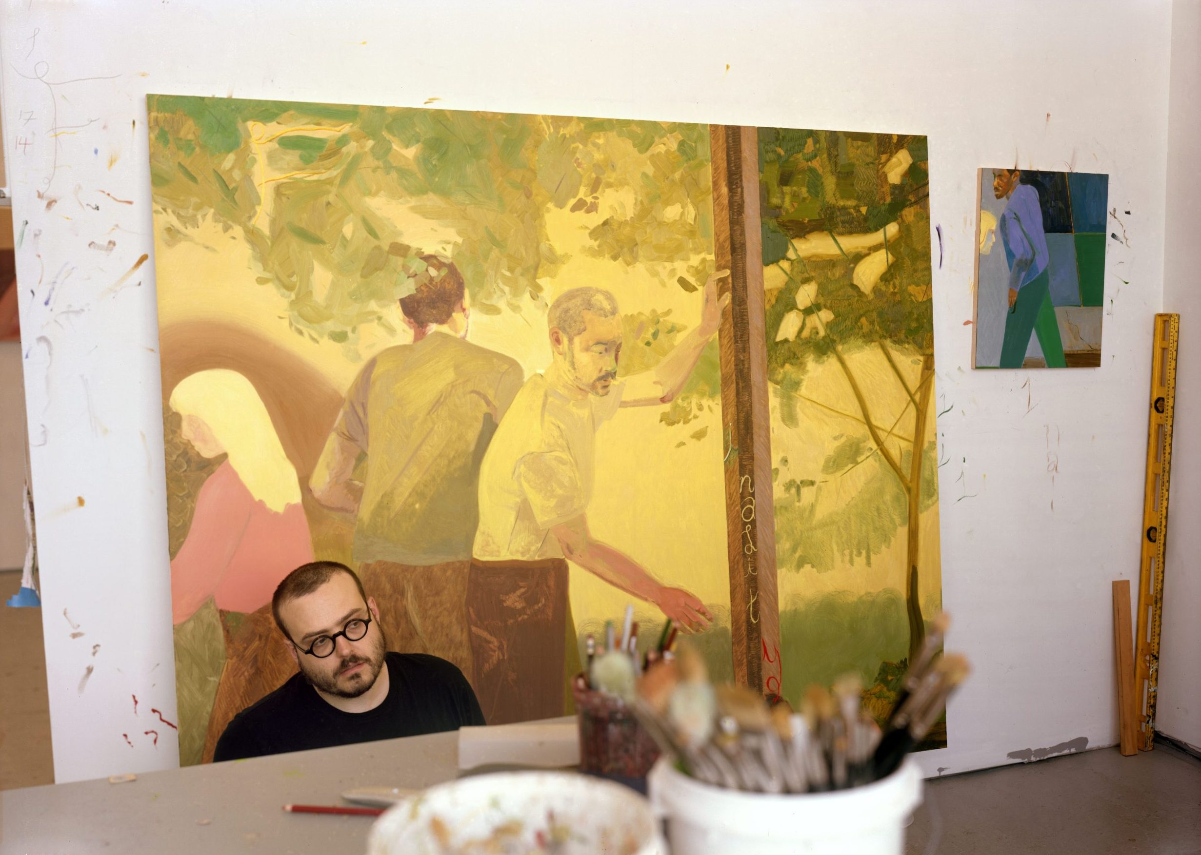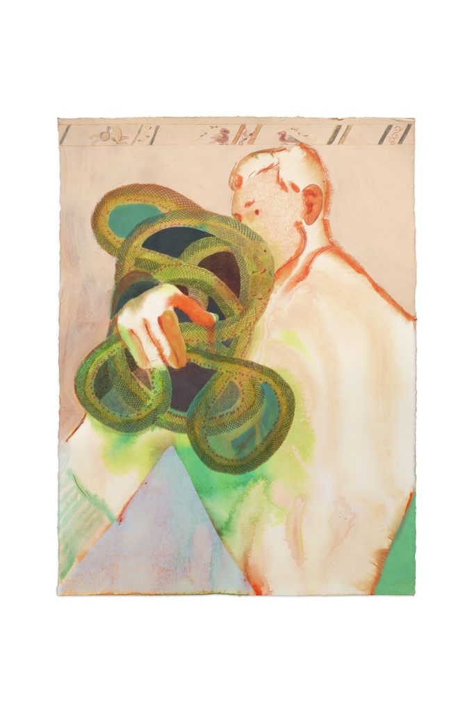 Cudahy devotedly collects images. His collection draws upon film stills, snapshots of his partner, ancient sites, hagiographic icons and the photography of his great uncle, Kenny Gardner (which his husband, Ian Lewandowski has been compiling). Cudahy returns to his collected images time and time again, for they have a potent quality, which sparks ideas and concepts for the works. Painting several versions of the same figure or scene, in each work he will make changes to the dimension, media, crop and narrative.