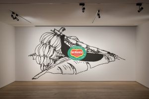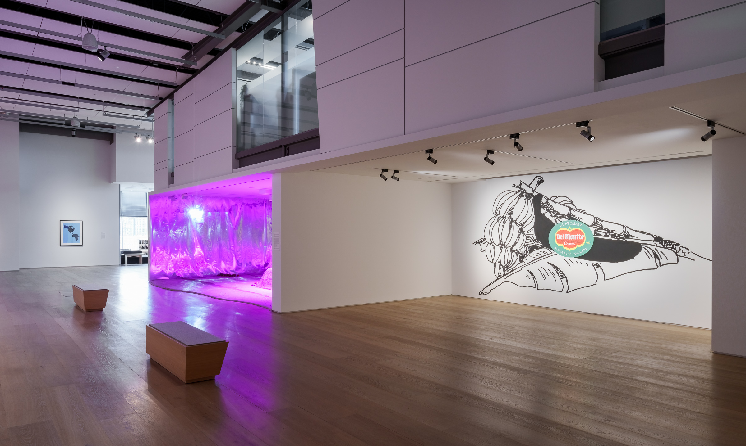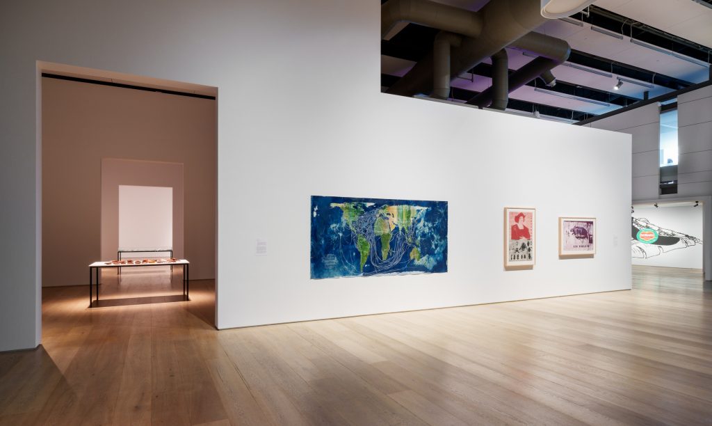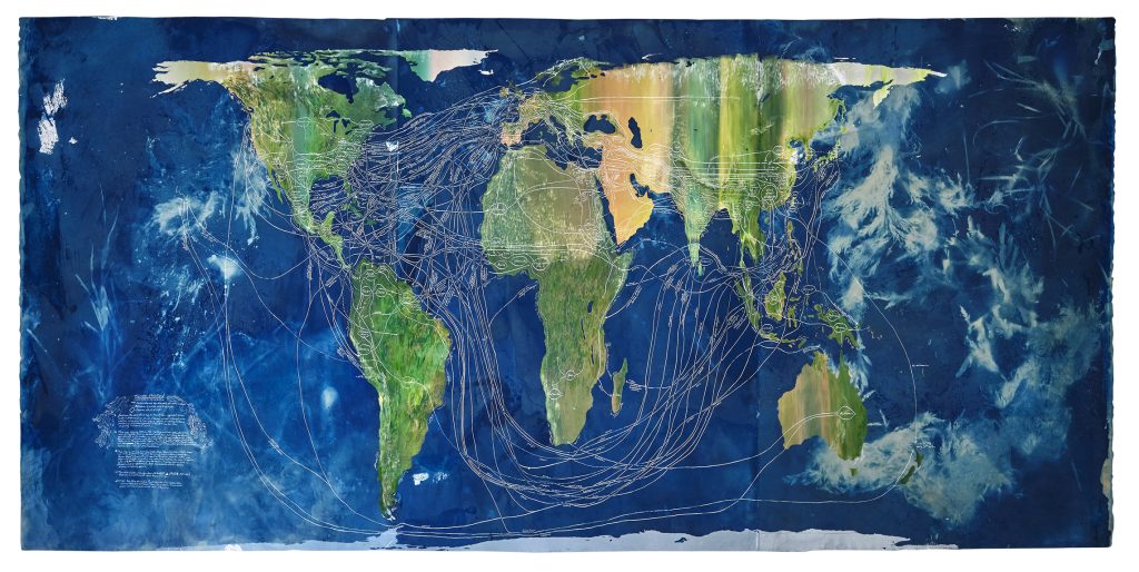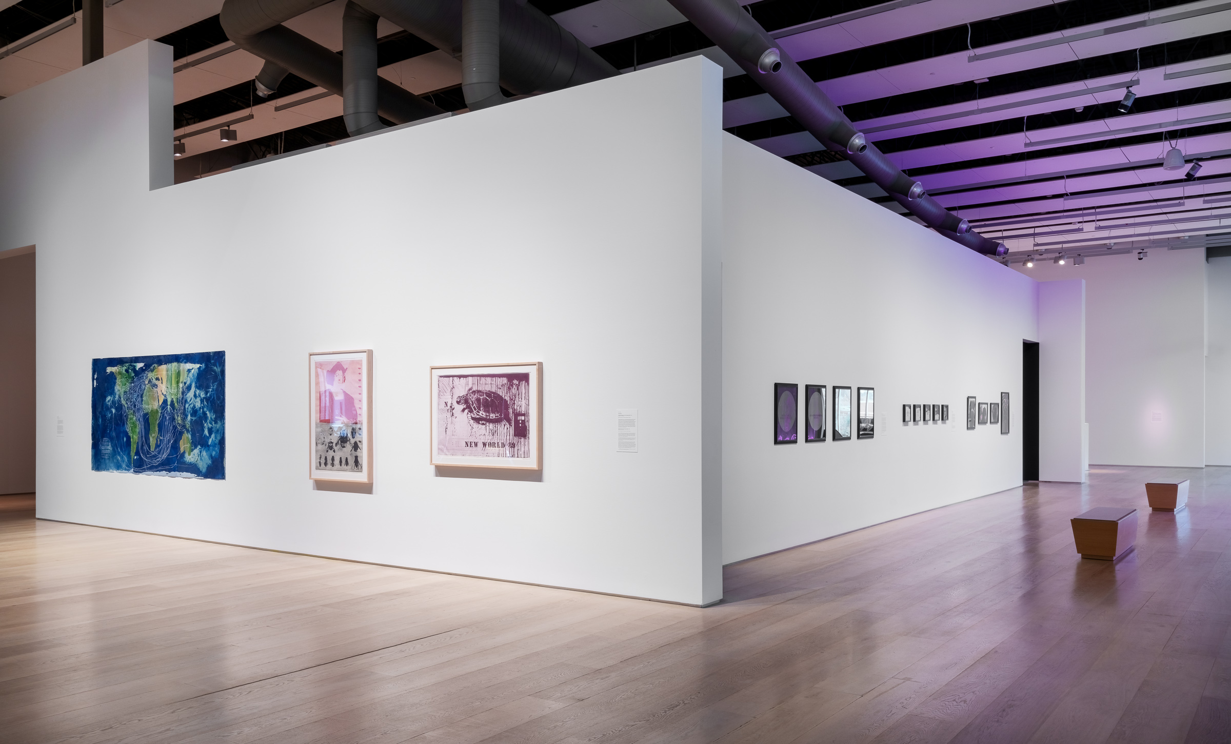 The flows of people and plants circulated through the routes of early European colonialism open the exhibition. Expanding on maps that simplify the “Columbian Exchange,” Connie Zheng’s Routes/Roots attempts to record the ways in which colonialism, slavery, and capitalistic enterprise have shaped the foods we eat and consider ‘native’ and how related human activities have transformed landscapes. Named after Christopher Columbus, the “Columbian Exchange” is the widespread transfer of plants and other material and non-material things between the so-called New (the Americas) and Old (Afro-Eurasia) Worlds. Valuable for food, medicine, and other industries, plants were a powerful motivator for colonial exploration and occupation. Carl Beam’s Columbus and Bees contrasts the power ascribed to figures such as Columbus against irrefutable natural forces, such as pollinators, without which plants and all that rely on them couldn’t exist. Beam’s New World suggests the disconnect between Indigenous and colonial conceptions of land and authority. Hank Willis Thomas’ A Place to Call Home illustrates the real and symbolic terms through which disparate geographical locations are deeply entwined. Thomas’ map connects North America with Africa, inextricably tying the enslavement of African people with the establishment of the United States and Canada.