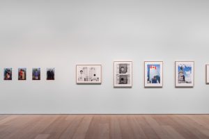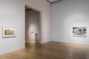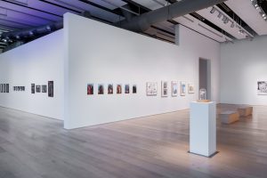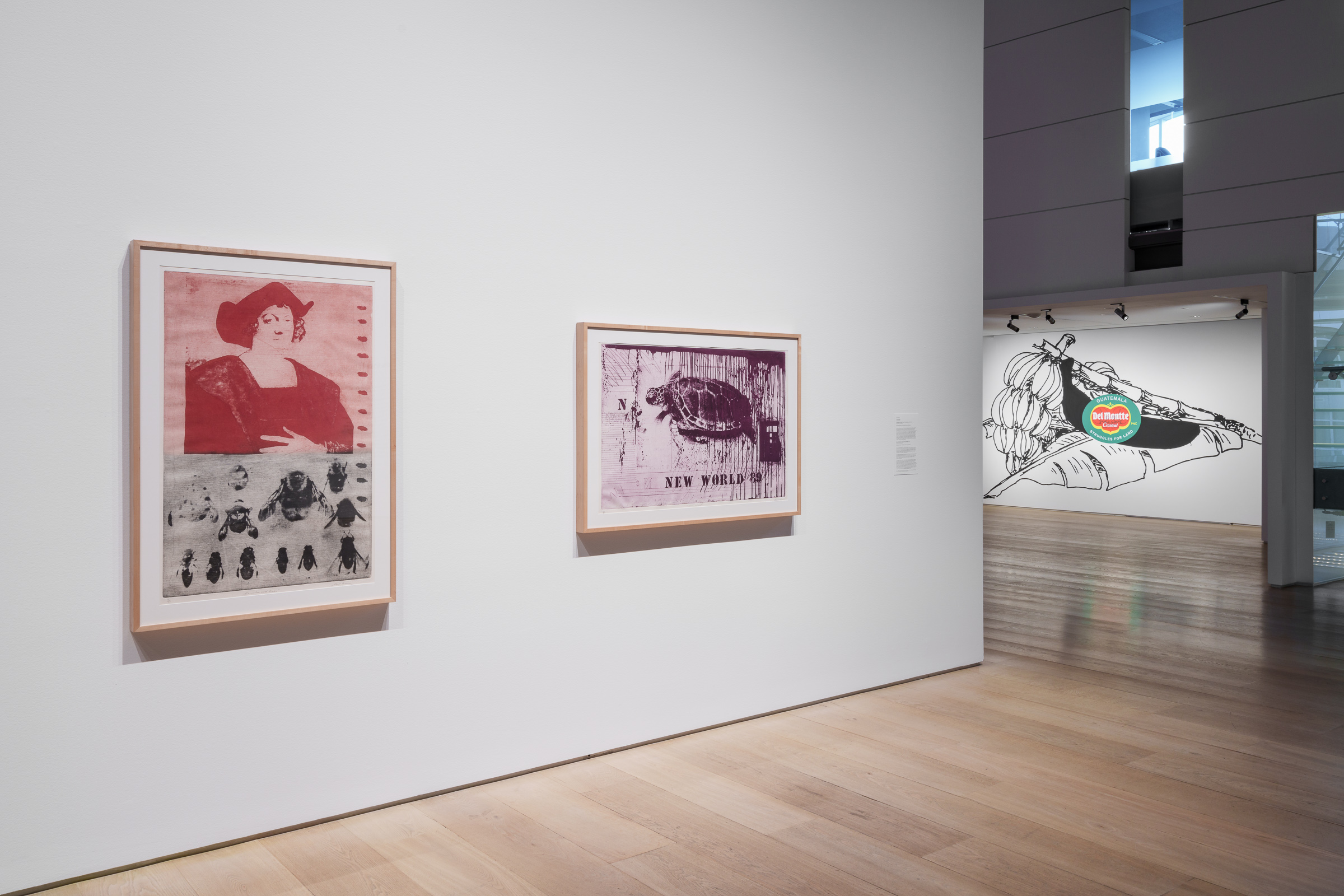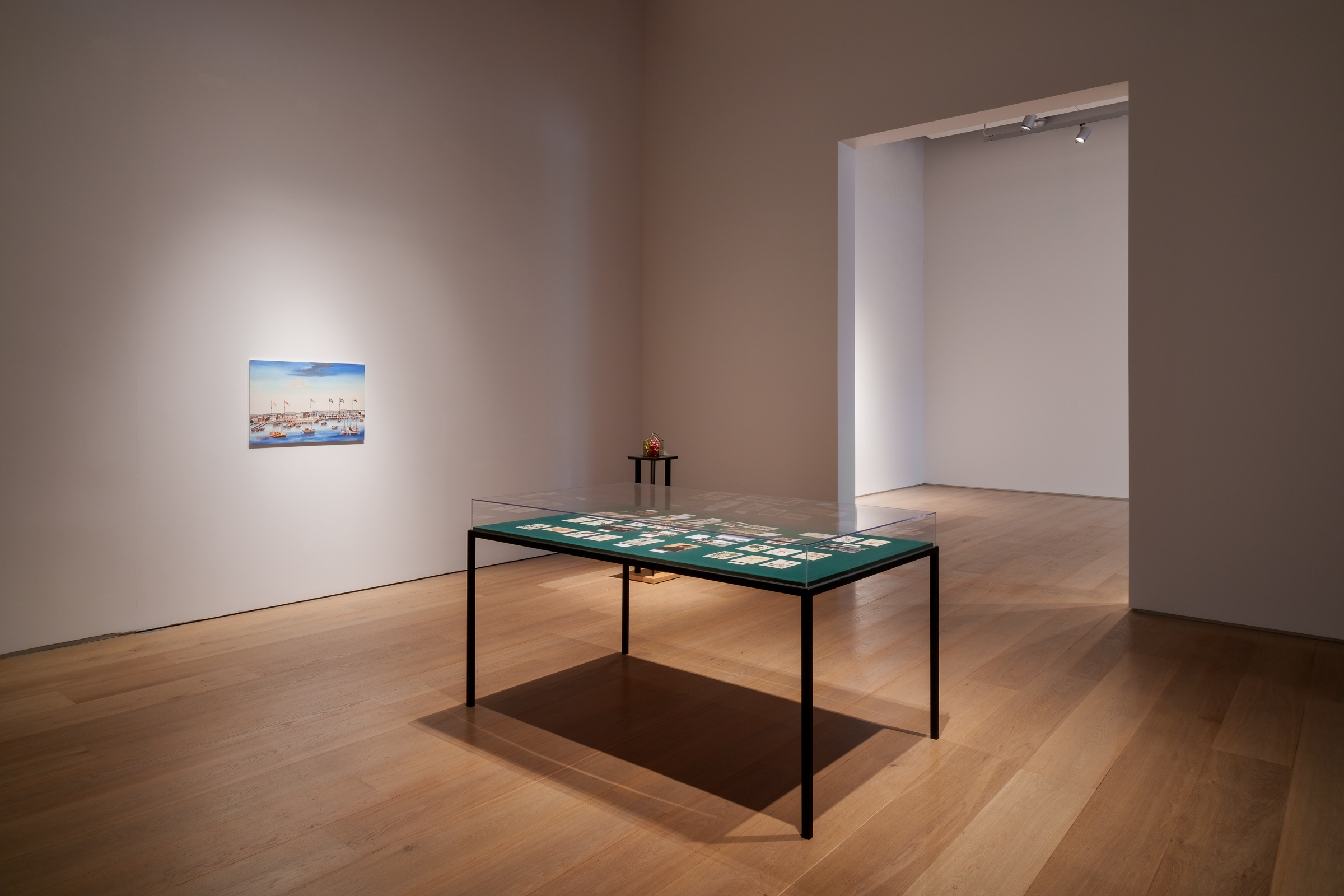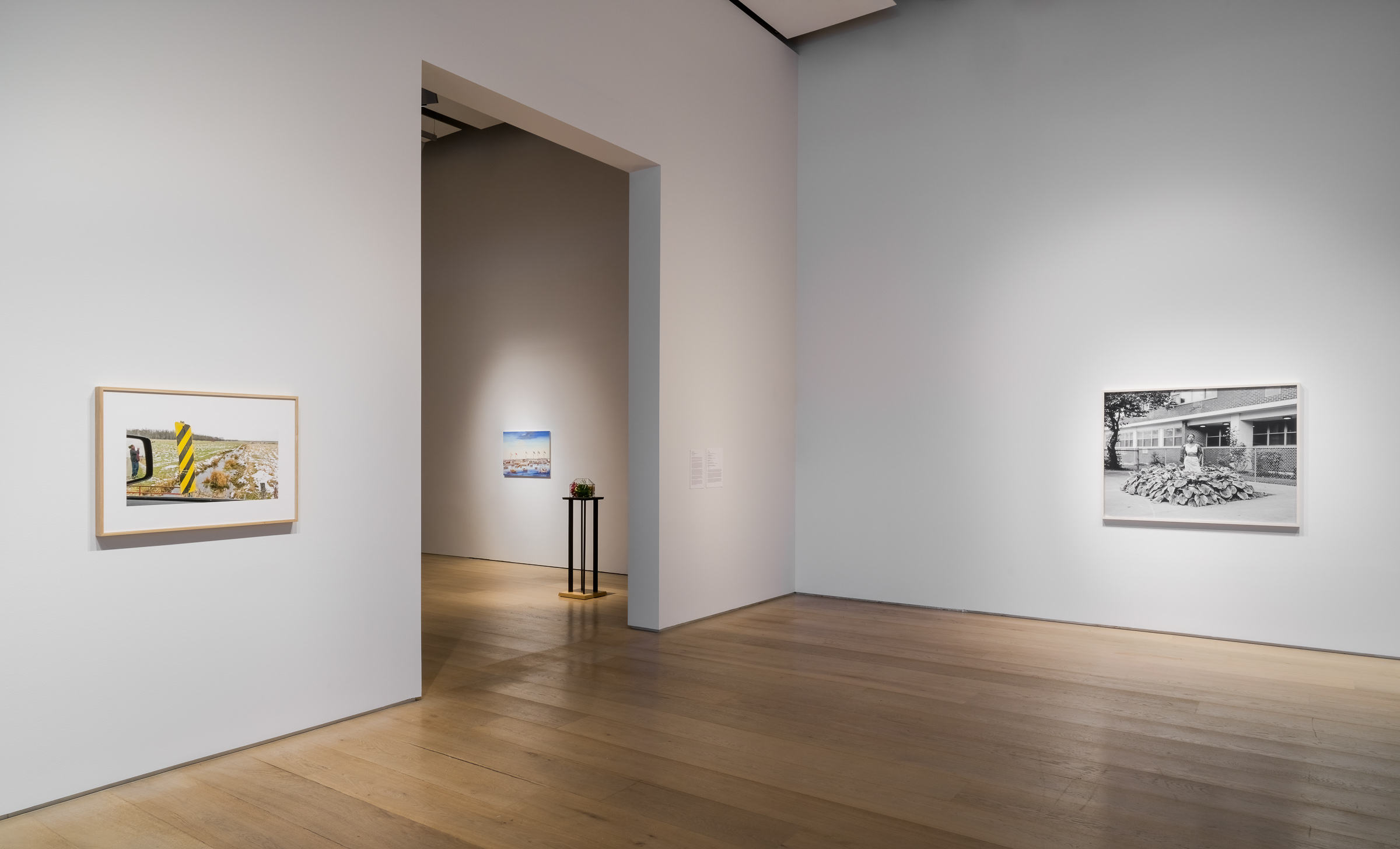The flows of people and plants circulated through the routes of early European colonialism open the exhibition. Expanding on maps that simplify the “Columbian Exchange,” Connie Zheng’s Routes/Roots attempts to record the ways in which colonialism, slavery, and capitalistic enterprise have shaped the foods we eat and consider ‘native’ and how related human activities have transformed landscapes. Named after Christopher Columbus, the “Columbian Exchange” is the widespread transfer of plants and other material and non-material things between the so-called New (the Americas) and Old (Afro-Eurasia) Worlds. Valuable for food, medicine, and other industries, plants were a powerful motivator for colonial exploration and occupation. Carl Beam’s Columbus and Bees contrasts the power ascribed to figures such as Columbus against irrefutable natural forces, such as pollinators, without which plants and all that rely on them couldn’t exist. Beam’s New World suggests the disconnect between Indigenous and colonial conceptions of land and authority. Hank Willis Thomas’ A Place to Call Home illustrates the real and symbolic terms through which disparate geographical locations are deeply entwined. Thomas’ map connects North America with Africa, inextricably tying the enslavement of African people with the establishment of the United States and Canada.