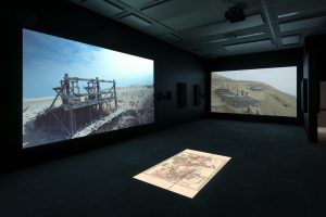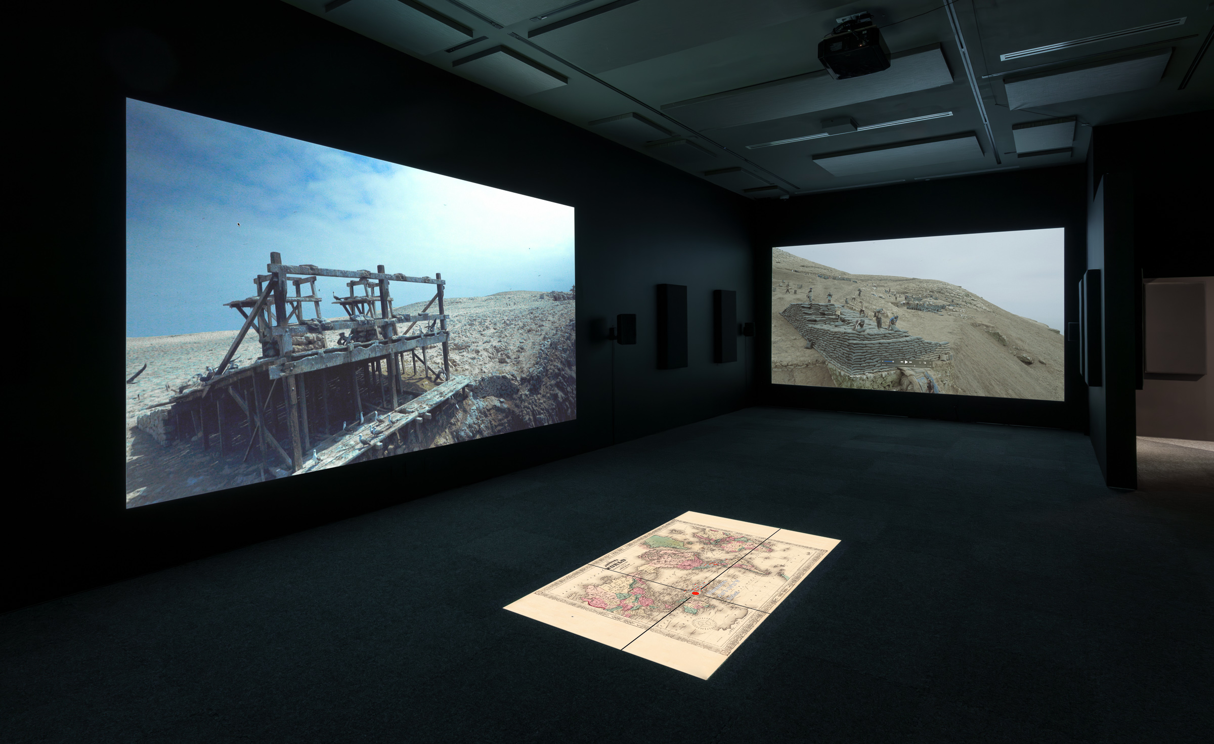 Moving from the spatial geography of colonial activities to its human geography, several works present natural elements as a way to symbolize the enmeshment of bodies with the landscapes they have moved across and toiled upon. In Deborah Jack’s Foremothers, salt materializes extraction and displacement as a constituent element of oceans, land, and the bodies and tears of trafficked Africans. A human form is placed centrally in Candice Lin’s La Charada China, embedded into a slab of earth, seeds, and plants—as interconnected as colonial expansion. Dinh Q. Lê’s The Colony was filmed on the Chincha islands in Peru, where colonies of birds leave mountains of excrement, or guano, which is subsequently extracted as a fertilizer. Monocultural plantation agriculture depletes soil, necessitating the use of such fertilizers. The abject process of hand mining the toxic material from cliffs was carried out by indentured Chinese labourers, many of whom died amid exploitative and unsafe labour practices.