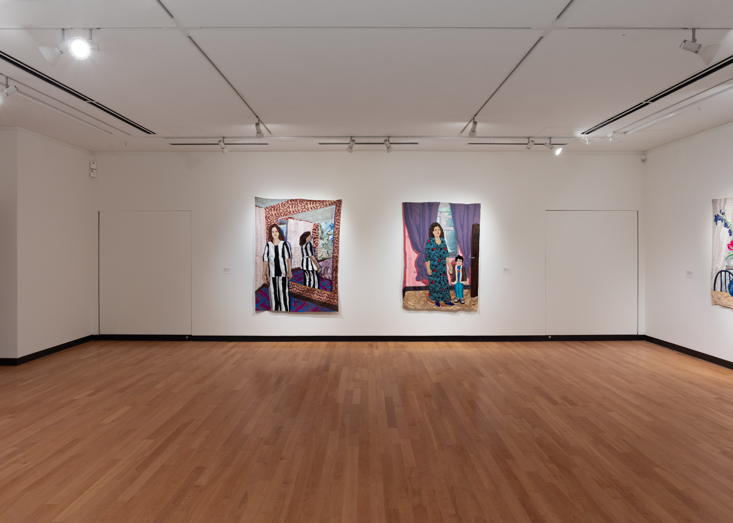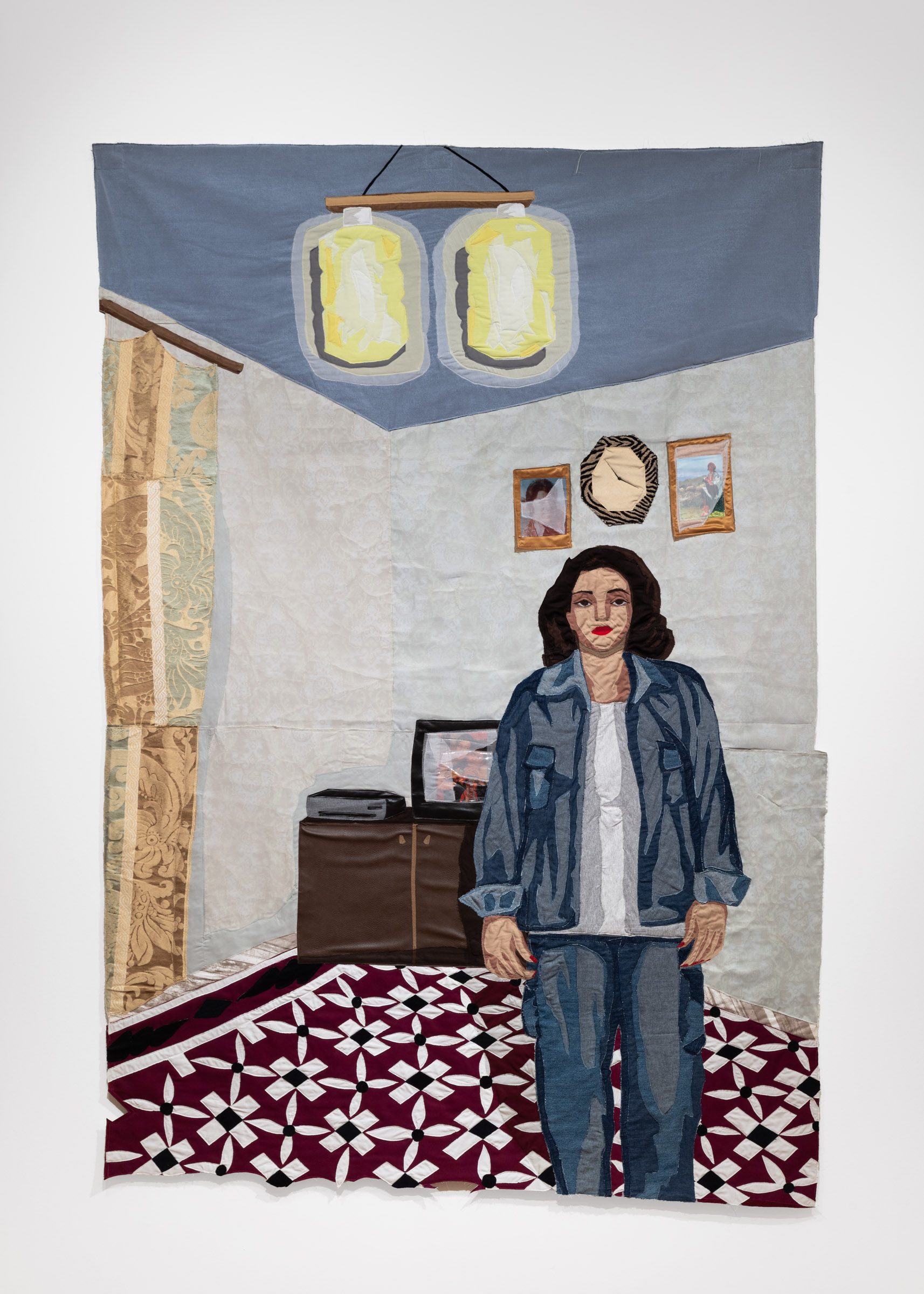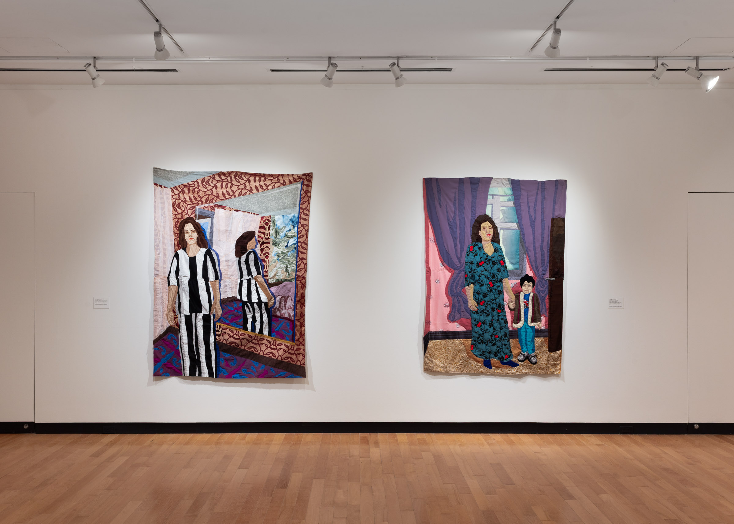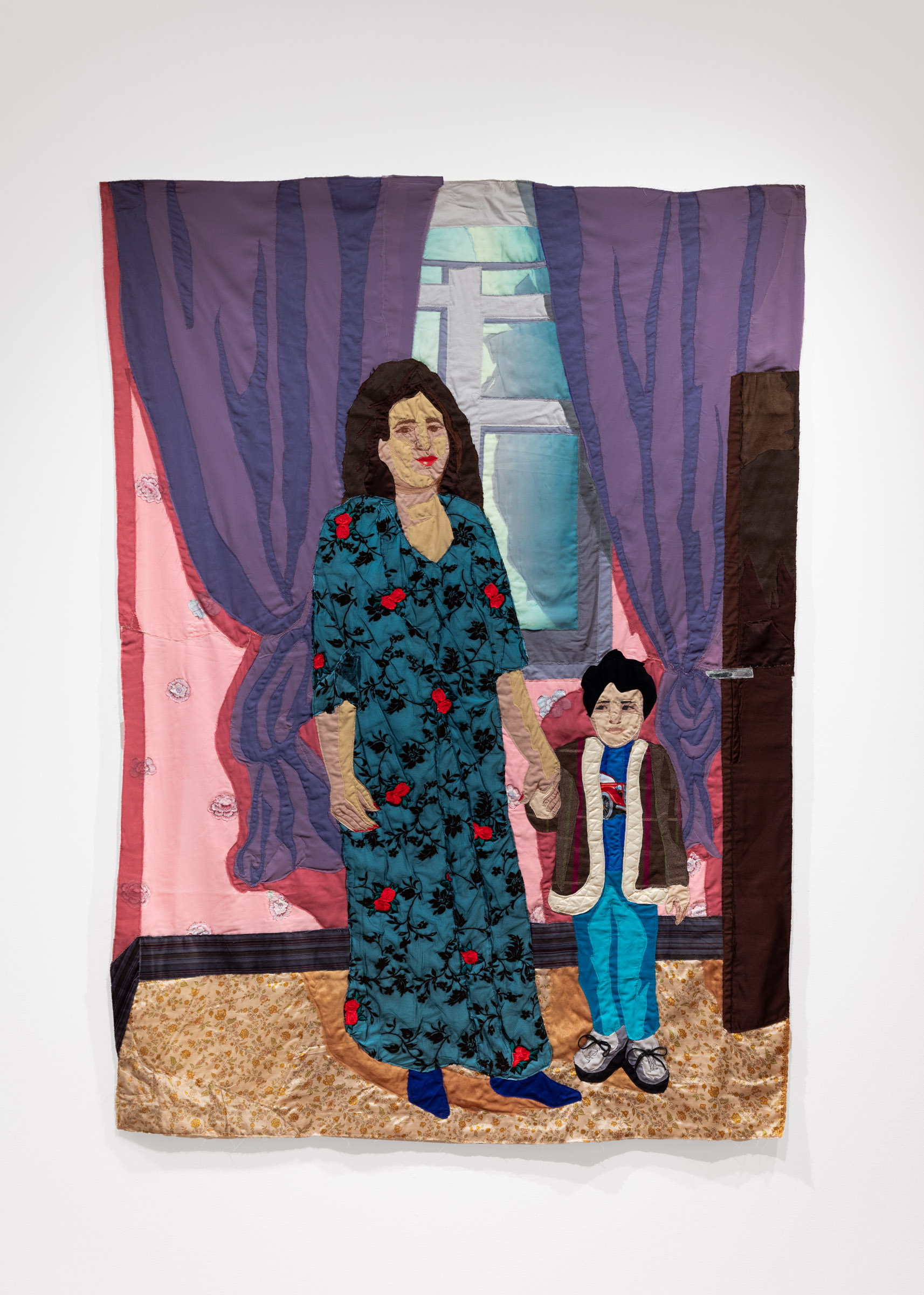 Amiri begins each work by creating a black and white sketch, which is then rendered in colour, sometimes with notes indicating possible textile or colour swatches. The colour sketches are then distilled and enlarged into detailed handmade patterns, which become the basis for the final work; textile collages that combine painting, printmaking, quilting, and appliqué techniques. Amiri carefully selects textiles that speak to the specificity of her personal history, acknowledging the ways in which textiles, through their uniquely close relationship to home and the body, become perfumed with meaning and memory over time. Amiri’s focus on textiles also nods to familial bonds—her mother taught her to sew, and her uncle was a tailor—and to long, diverse histories of feminist textile-based practices.