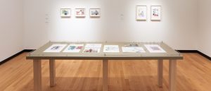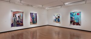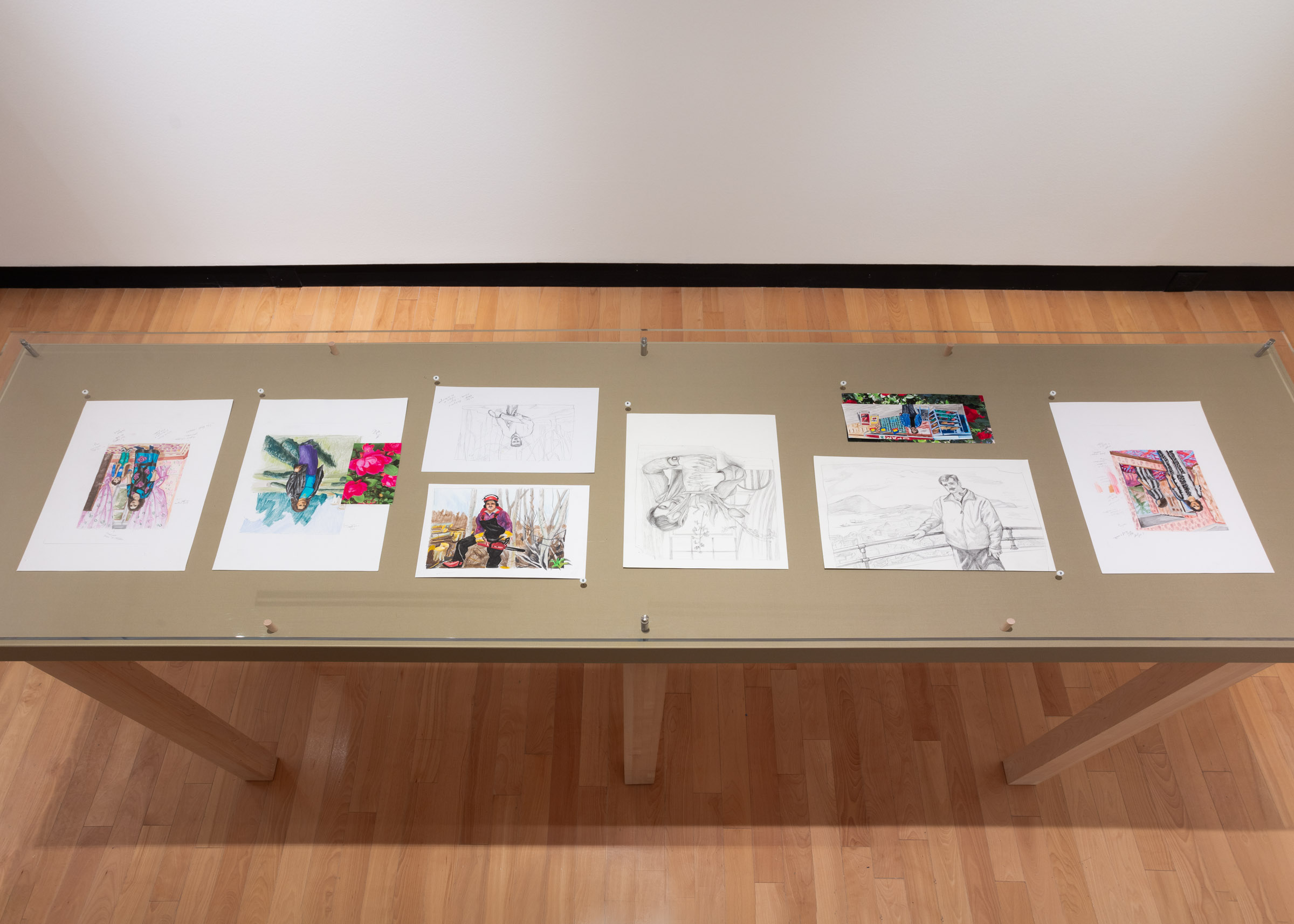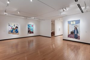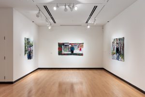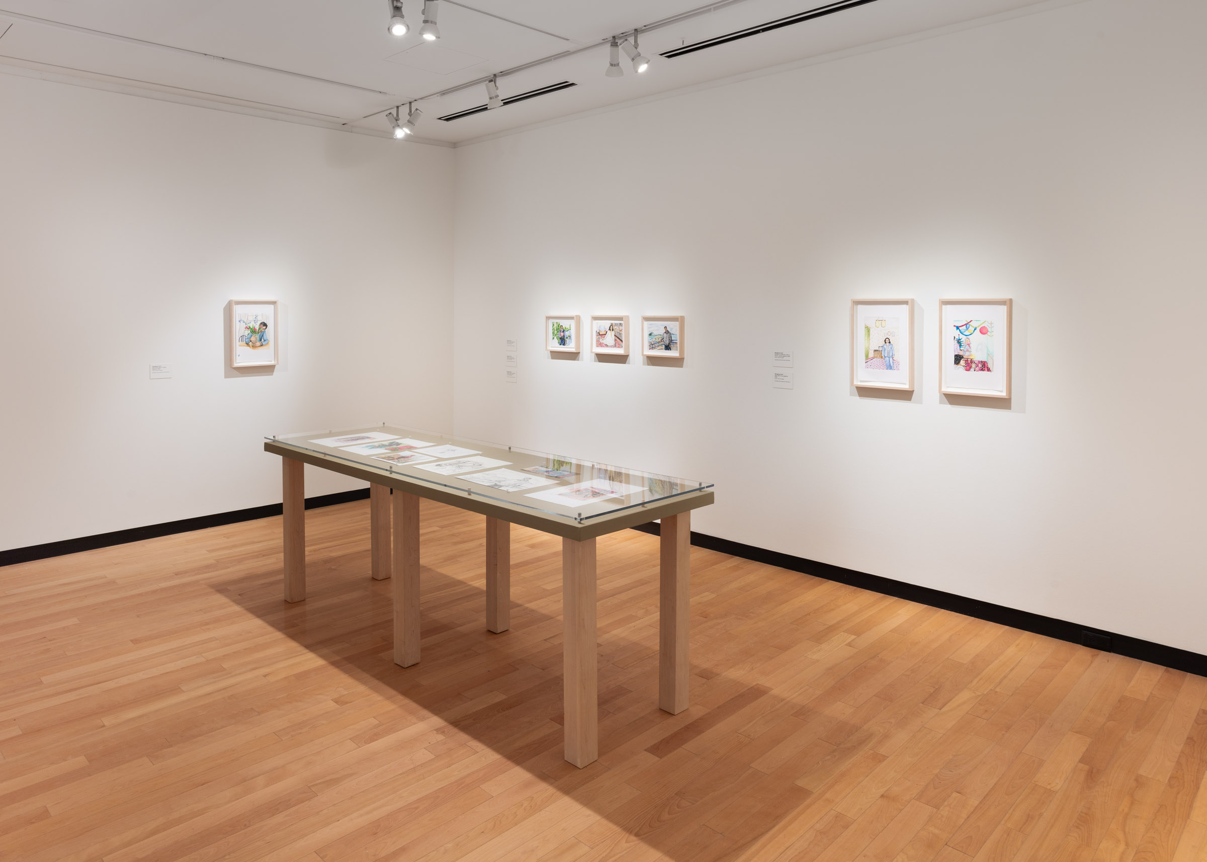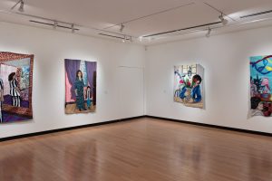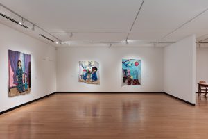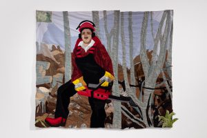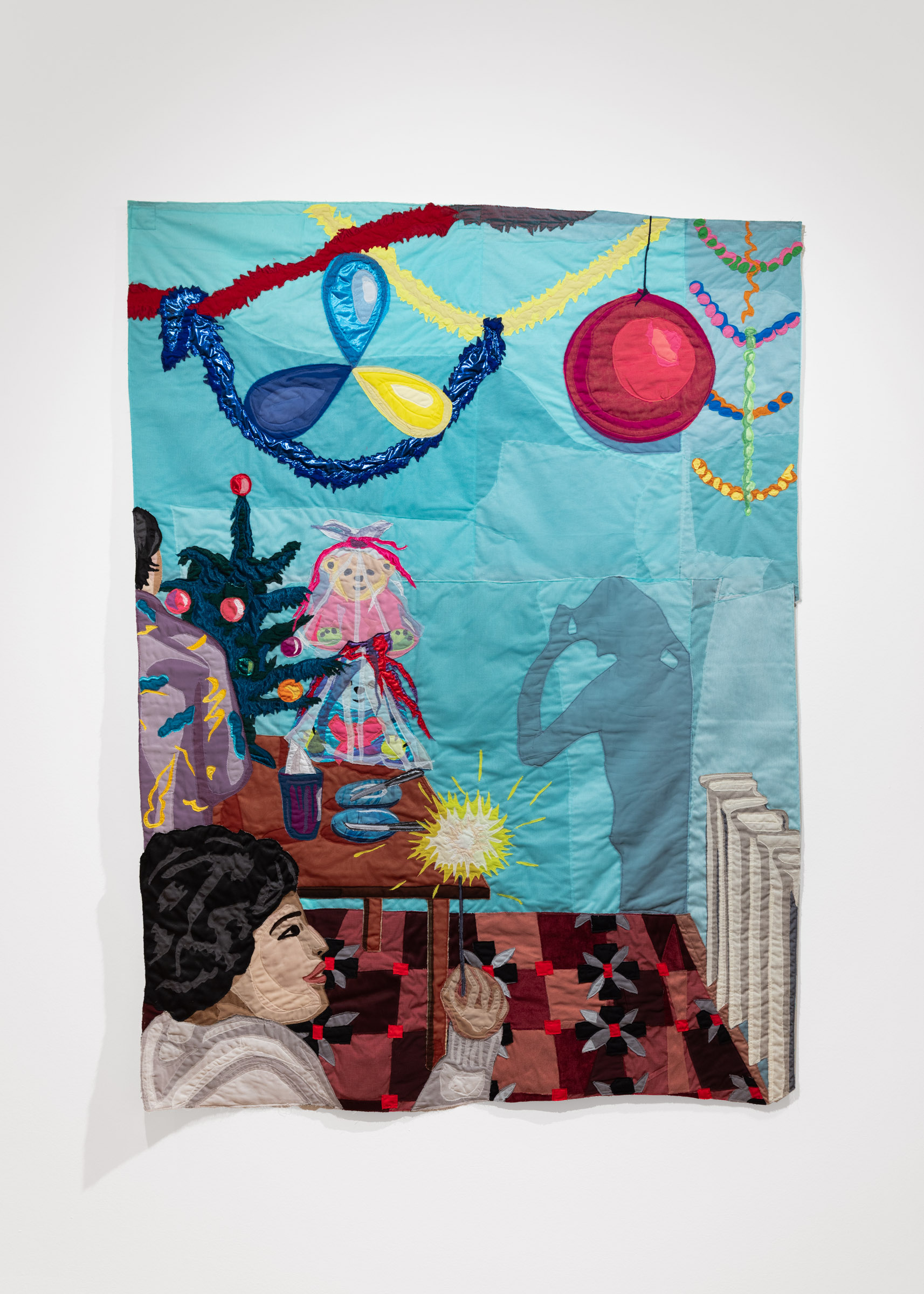Amiri begins each work by creating a black and white sketch, which is then rendered in colour, sometimes with notes indicating possible textile or colour swatches. The colour sketches are then distilled and enlarged into detailed handmade patterns, which become the basis for the final work; textile collages that combine painting, printmaking, quilting, and appliqué techniques. Amiri carefully selects textiles that speak to the specificity of her personal history, acknowledging the ways in which textiles, through their uniquely close relationship to home and the body, become perfumed with meaning and memory over time. Amiri’s focus on textiles also nods to familial bonds—her mother taught her to sew, and her uncle was a tailor—and to long, diverse histories of feminist textile-based practices.