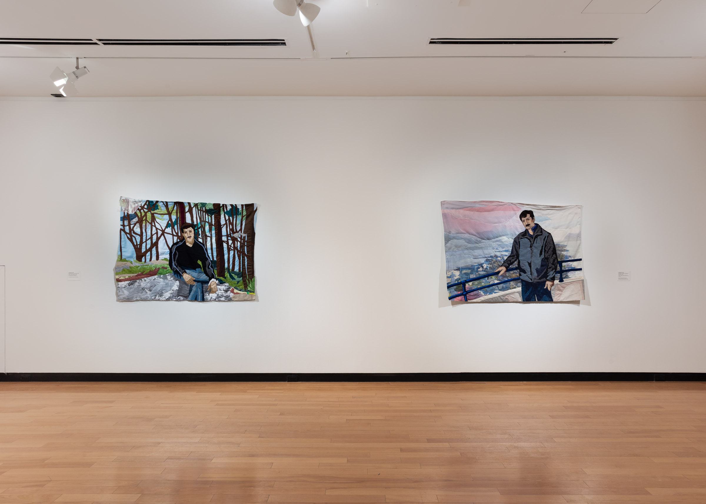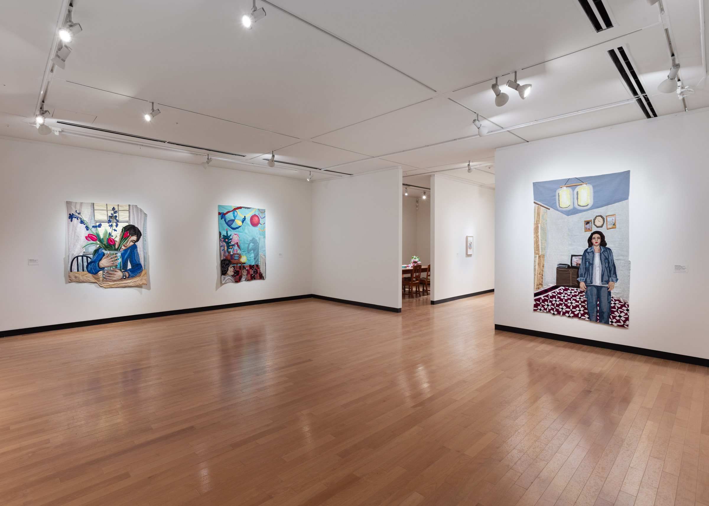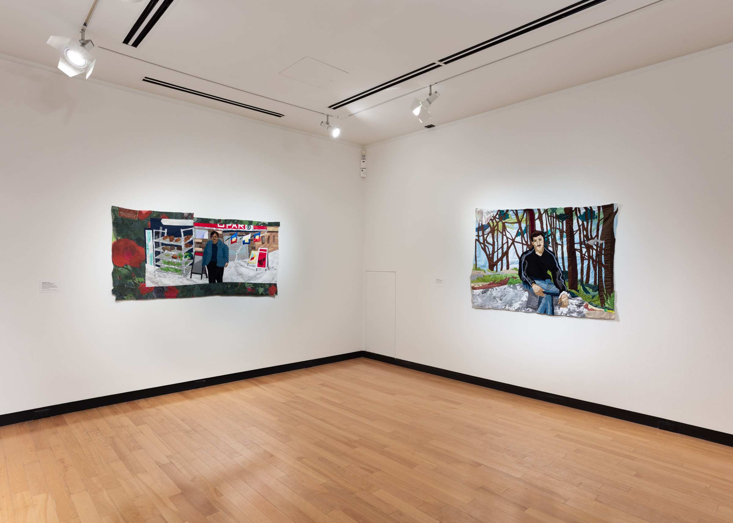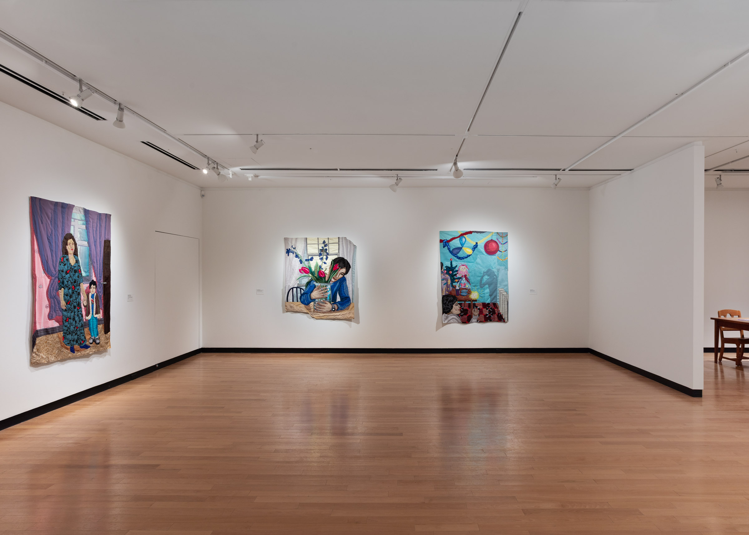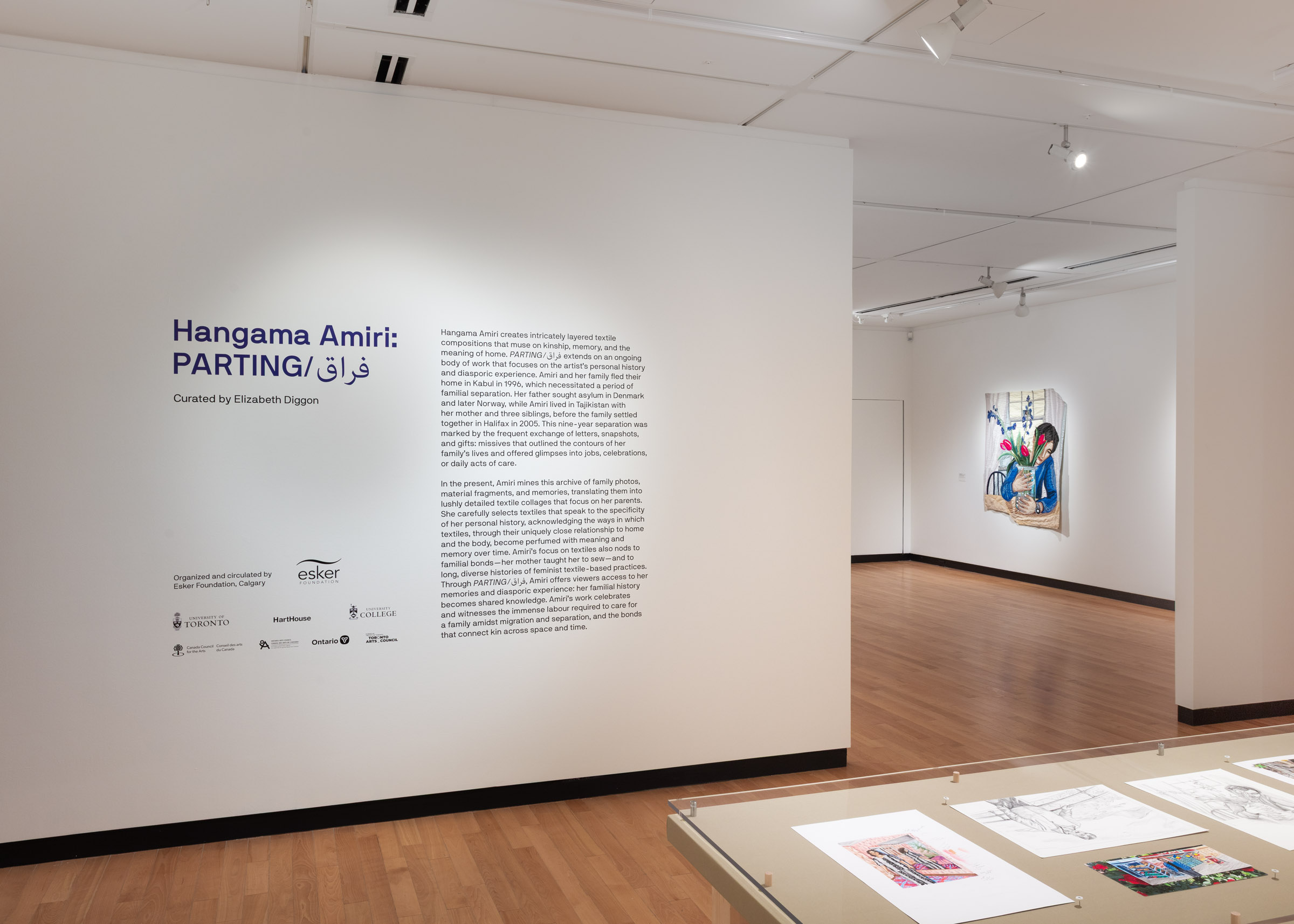 Hangama Amiri creates intricately layered textile compositions that muse on home, kinship, and memory. PARTING/فراق builds on an ongoing body of work that focuses on the artist’s personal history and diasporic experience. Following the rise of the Taliban in Afghanistan, Amiri and her family fled their home in Kabul in 1996, which necessitated a period of familial separation. Her father worked in Denmark and later Norway, while Amiri lived in Dushanbe, Tajikistan with her mother and three siblings, before the family settled together in Halifax in 2005. This nine-year separation was marked by the frequent exchange of letters, snapshots, and gifts; messages that outlined the contours of her family’s lives and offered glimpses into jobs, celebrations, or daily acts of care.