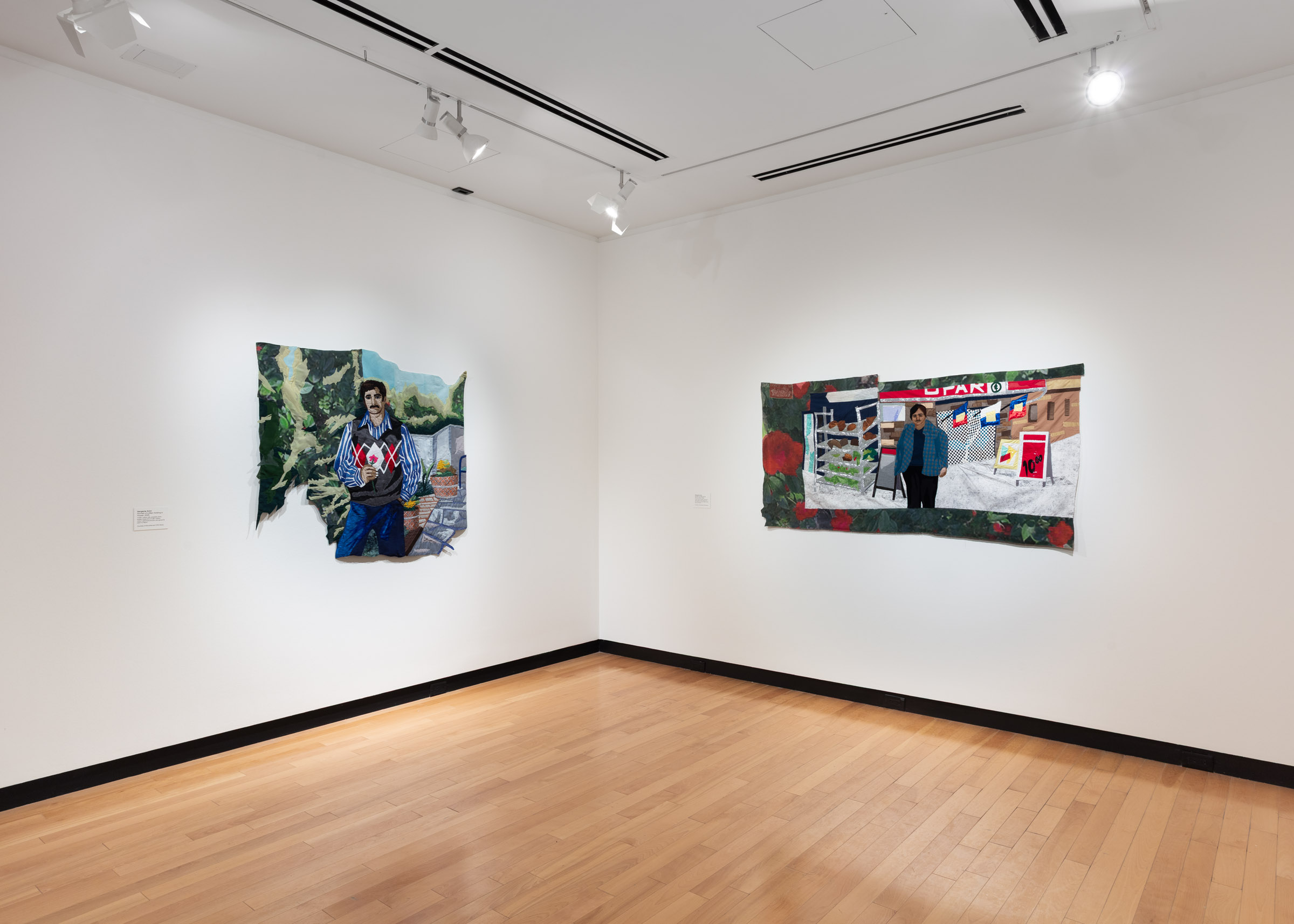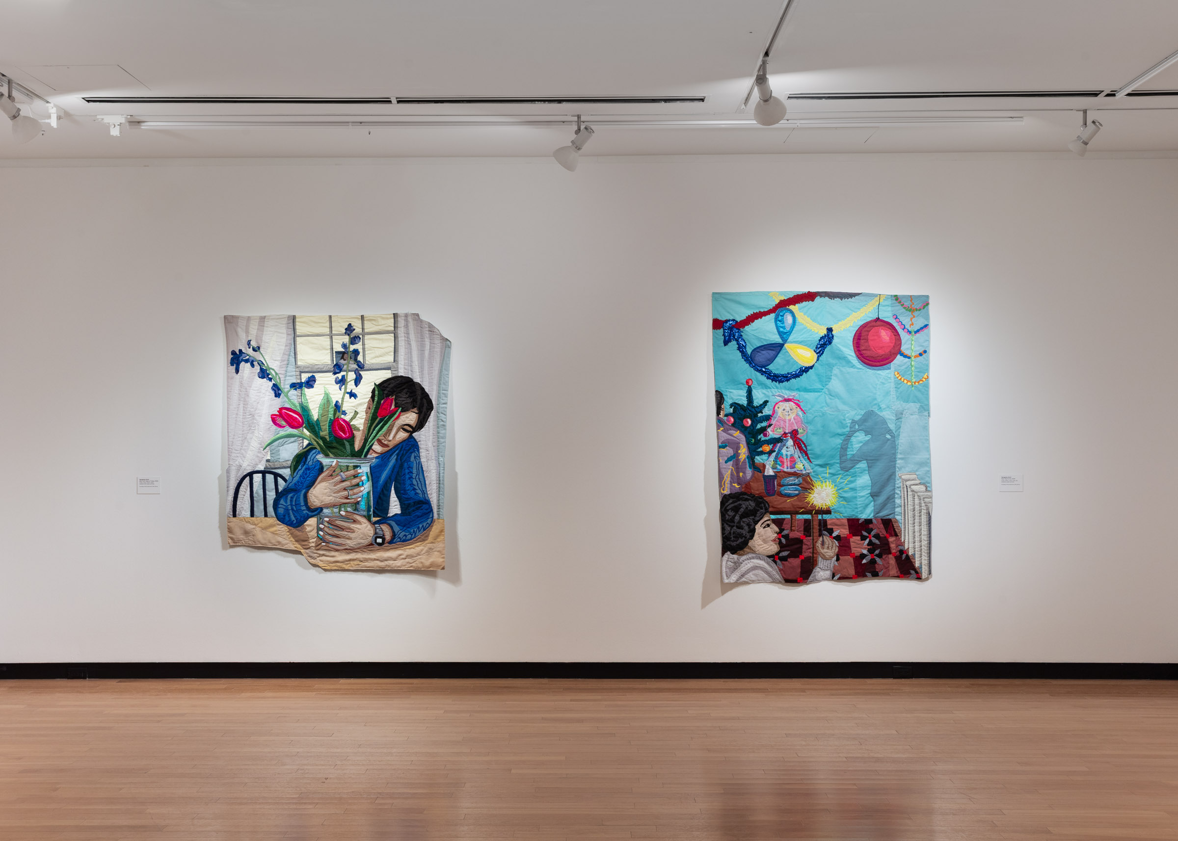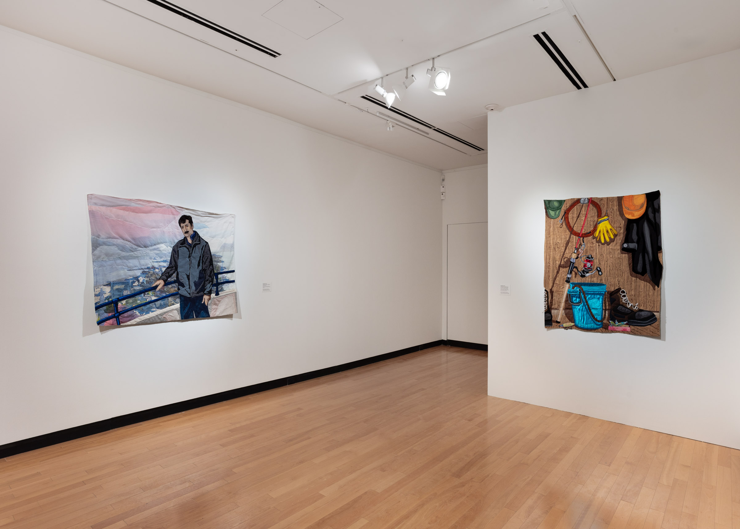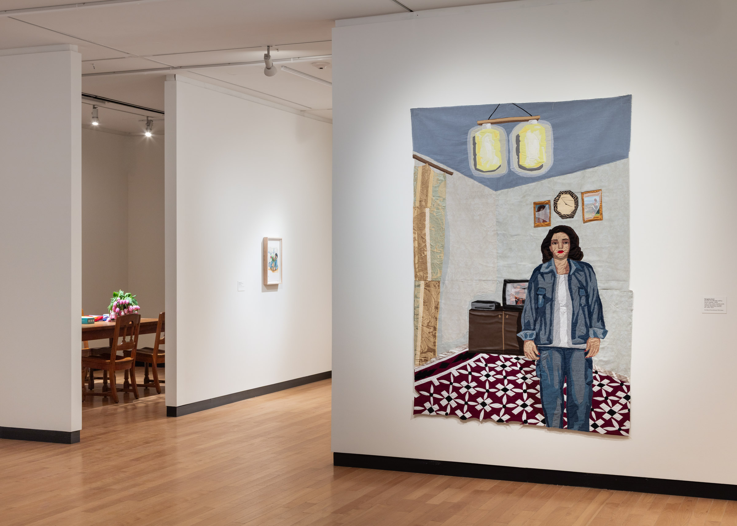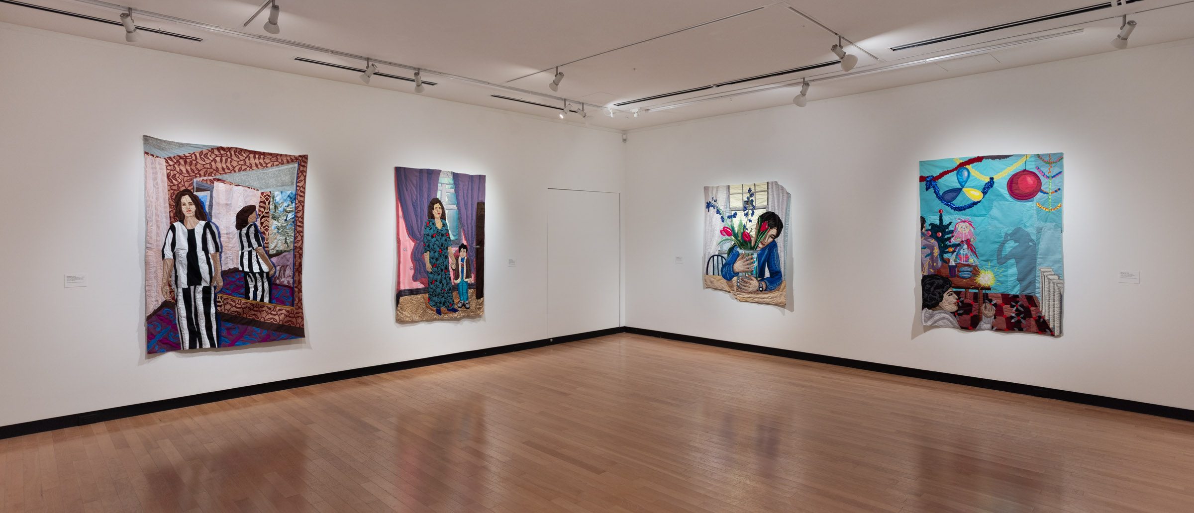 Hangama Amiri creates intricately layered textile compositions that muse on home, kinship, and memory. PARTING/فراق builds on an ongoing body of work that focuses on the artist’s personal history and diasporic experience. Following the rise of the Taliban in Afghanistan, Amiri and her family fled their home in Kabul in 1996, which necessitated a period of familial separation. Her father worked in Denmark and later Norway, while Amiri lived in Dushanbe, Tajikistan with her mother and three siblings, before the family settled together in Halifax in 2005. This nine-year separation was marked by the frequent exchange of letters, snapshots, and gifts; messages that outlined the contours of her family’s lives and offered glimpses into jobs, celebrations, or daily acts of care.