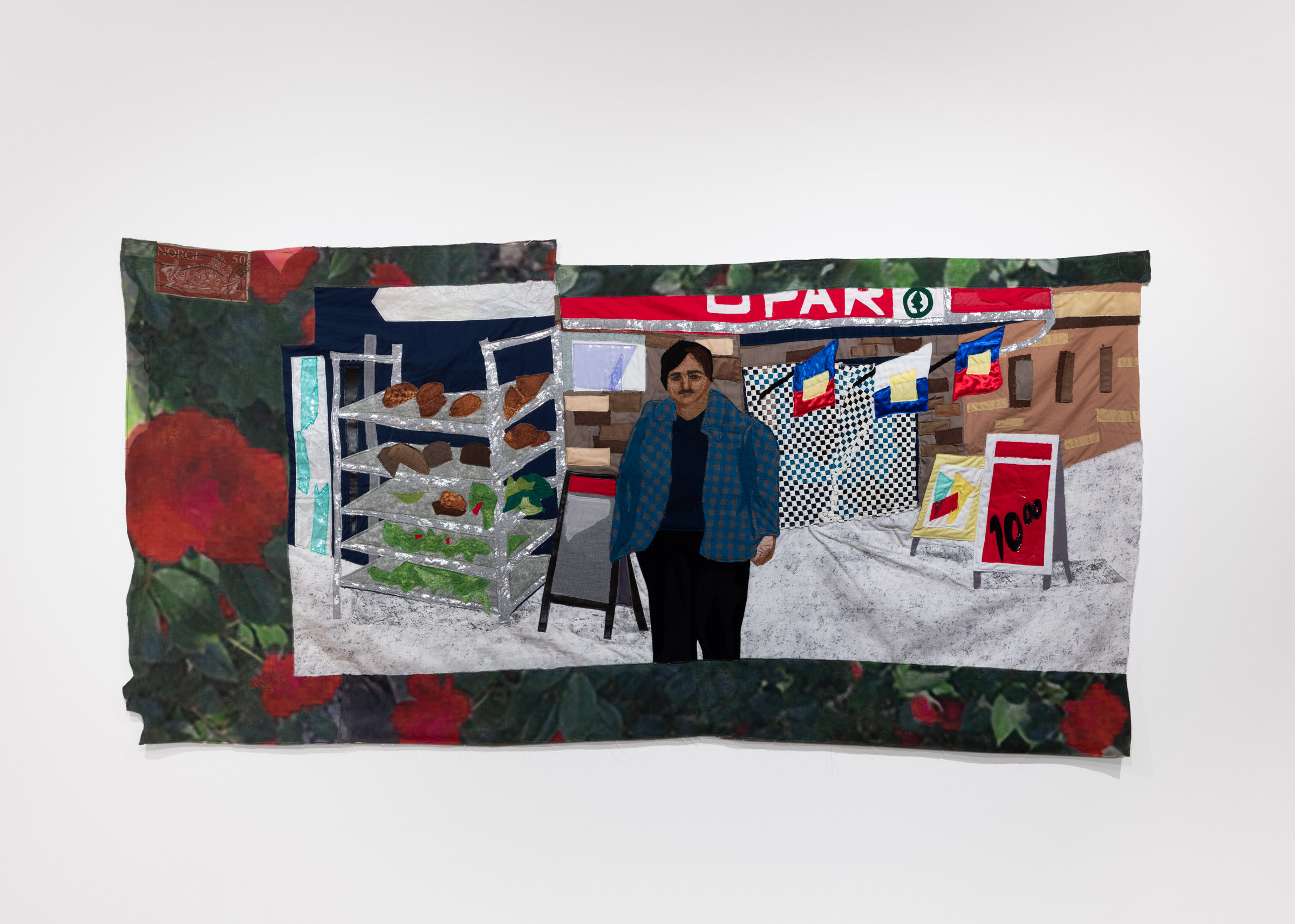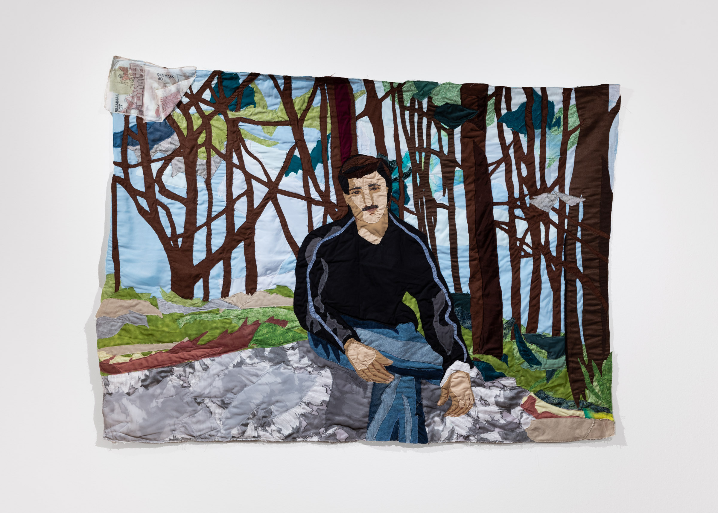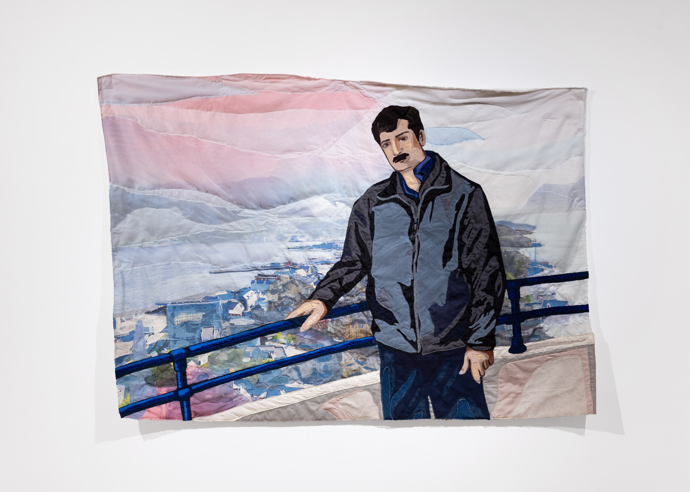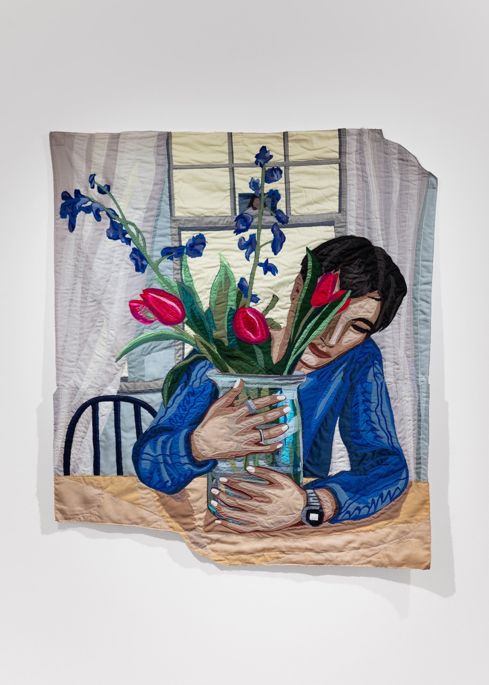 In the present, Amiri mines this archive of family photos, material fragments, and memories, translating them into lushly detailed textile collages that focus on her parents. For instance, Woman Before a Mirror recalls a photograph of Amiri’s mother standing in a favourite outfit in the primary bedroom of their Dushanbe apartment. The details are intensely specific to this period of her life: the bedroom’s wallpaper and furnishings evoke the prevalence of Soviet-era interior design and architecture in Tajikistan, a former Soviet Republic. Elsewhere, Man with Vase of Tulips is an imagined portrait of Amiri’s father in an apartment in Norway, where he worked for a tulip producer. His tender embrace of the flowers in their vase speaks to their symbolic import as a source of income for the family, and situates them as a proxy for his labour and care.