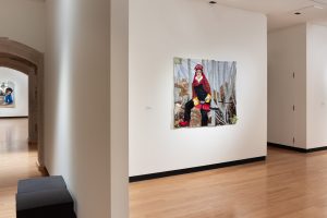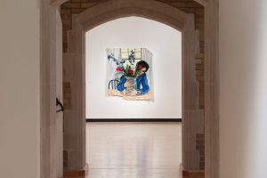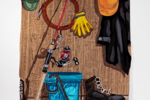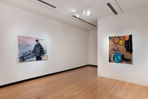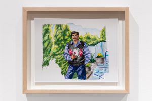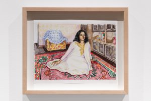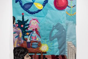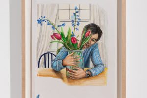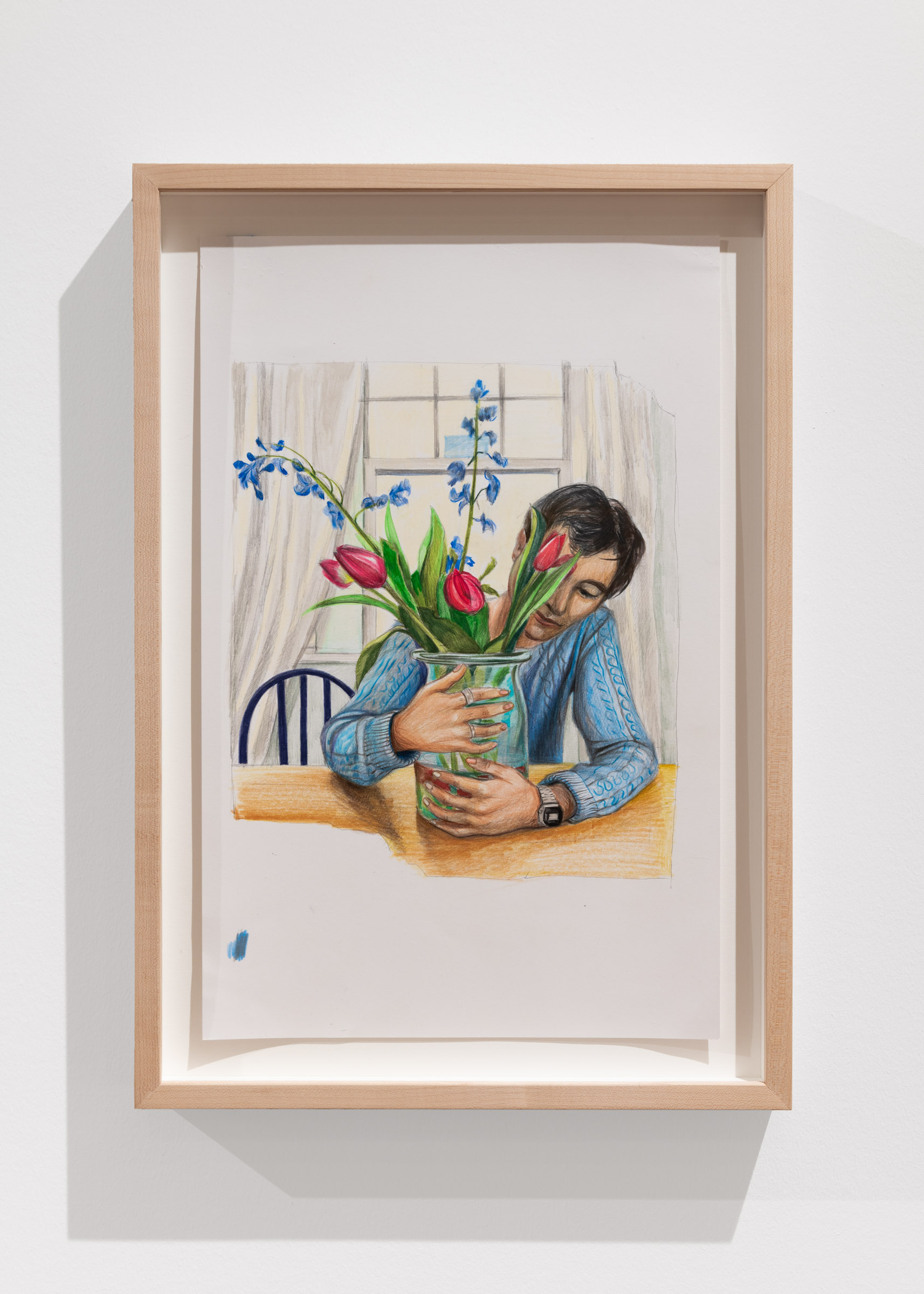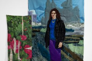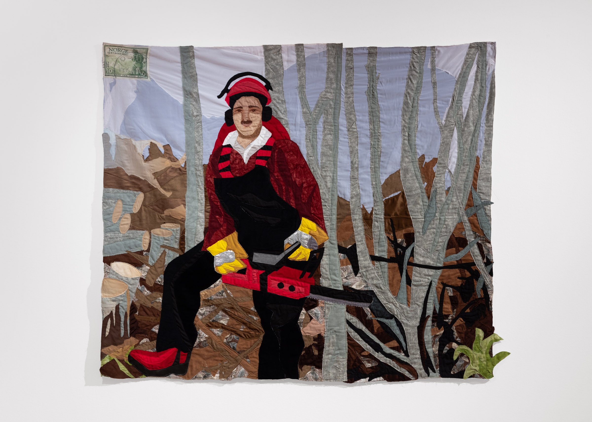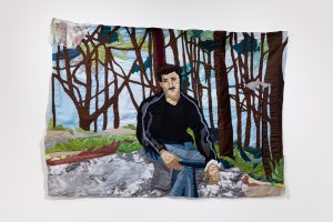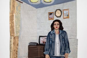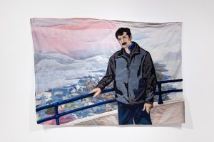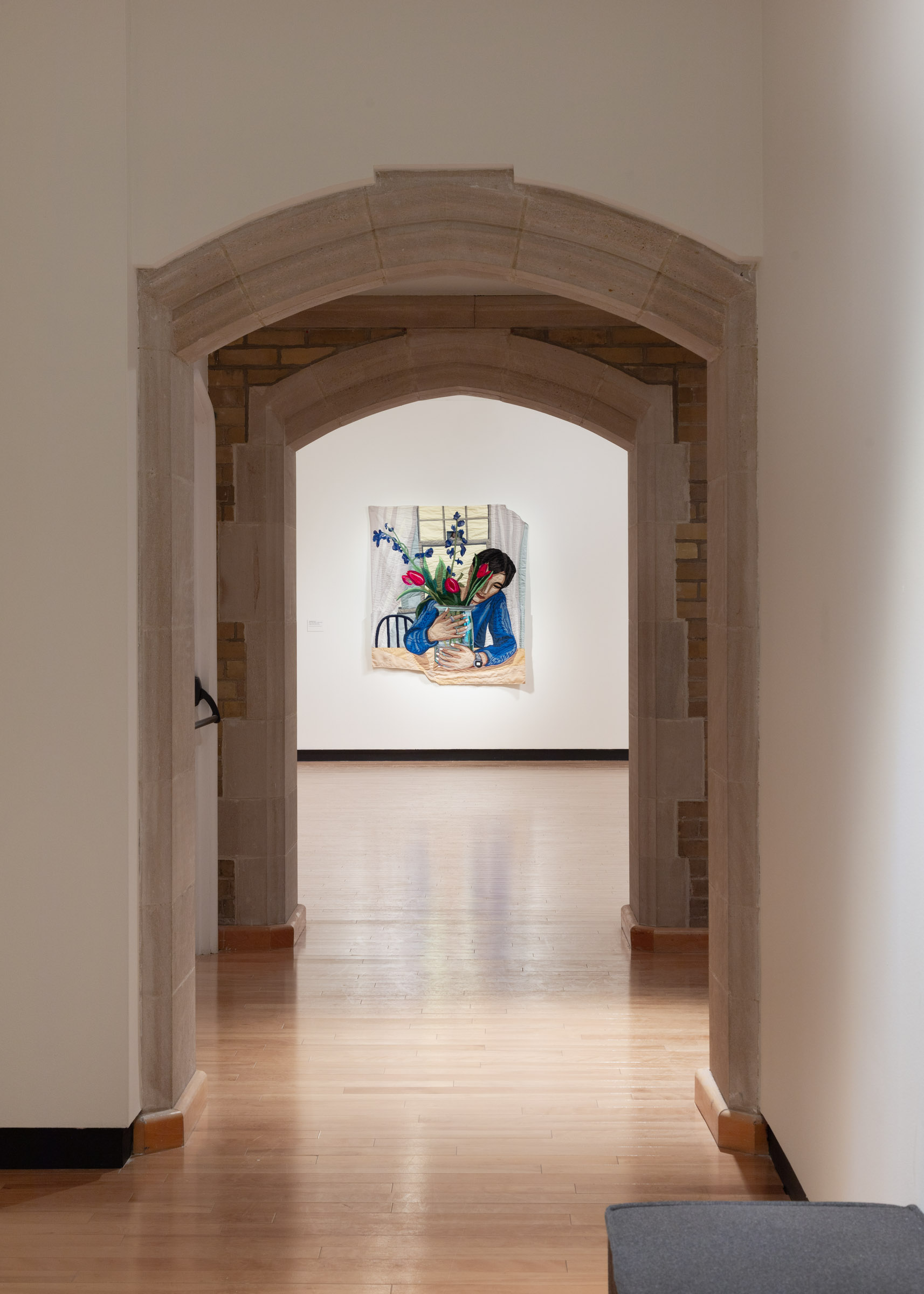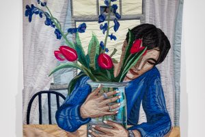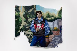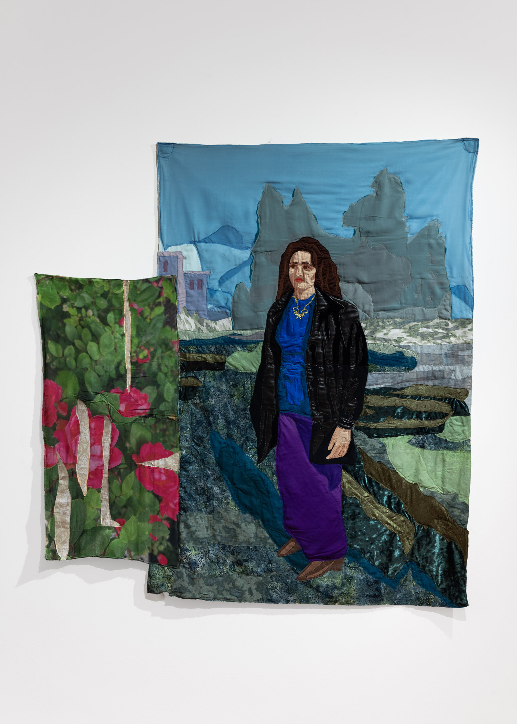 In the present, Amiri mines this archive of family photos, material fragments, and memories, translating them into lushly detailed textile collages that focus on her parents. For instance, Woman Before a Mirror recalls a photograph of Amiri’s mother standing in a favourite outfit in the primary bedroom of their Dushanbe apartment. The details are intensely specific to this period of her life: the bedroom’s wallpaper and furnishings evoke the prevalence of Soviet-era interior design and architecture in Tajikistan, a former Soviet Republic. Elsewhere, Man with Vase of Tulips is an imagined portrait of Amiri’s father in an apartment in Norway, where he worked for a tulip producer. His tender embrace of the flowers in their vase speaks to their symbolic import as a source of income for the family, and situates them as a proxy for his labour and care.