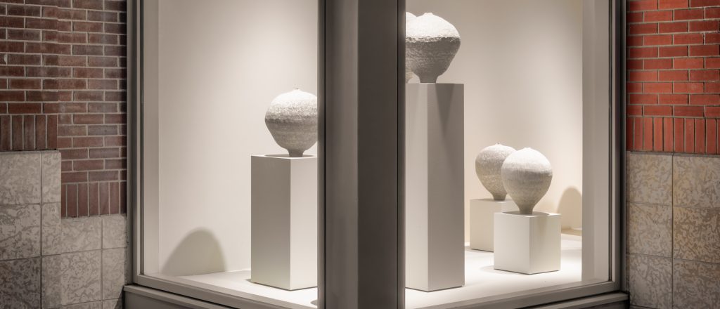 In the Balance, Zingeler’s new site-specific installation, offers a series of ceramic vessels inspired by the overlooked beauty and labyrinthine complexity of wasp nests. While wasps (of which there are over 100,000 known species, and potentially millions unknown) tend to be popularly maligned as vengeful pests, their predilection for both predation and pollination make them crucial to the balance of an ecosystem. Wasps are also inveterate makers. Certain varieties of wasp mix tree bark or other plant matter with their saliva to make a fine, paper-like substance which forms the hexagonal architecture of their nests. For Zingeler, these paper wasp nests are a source of endless fascination, pointing to the wasps’ material ingenuity and highly complex social structure, and to seasonal cycles of renewal, growth, and dormancy.