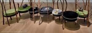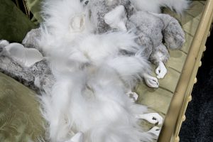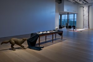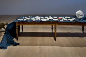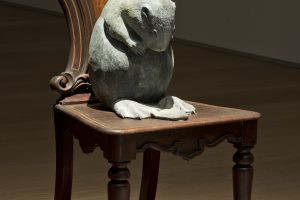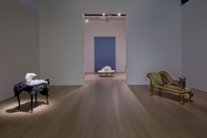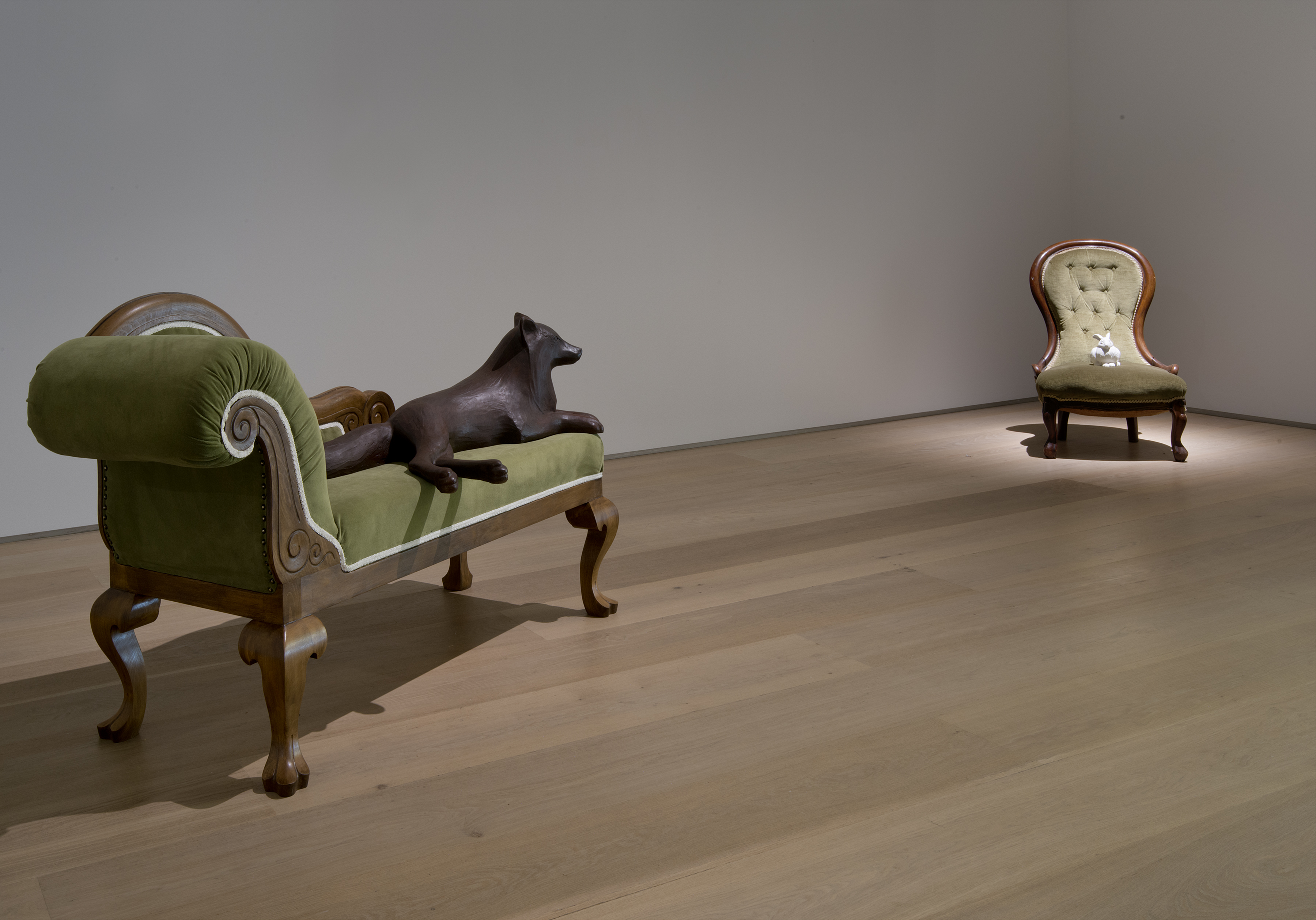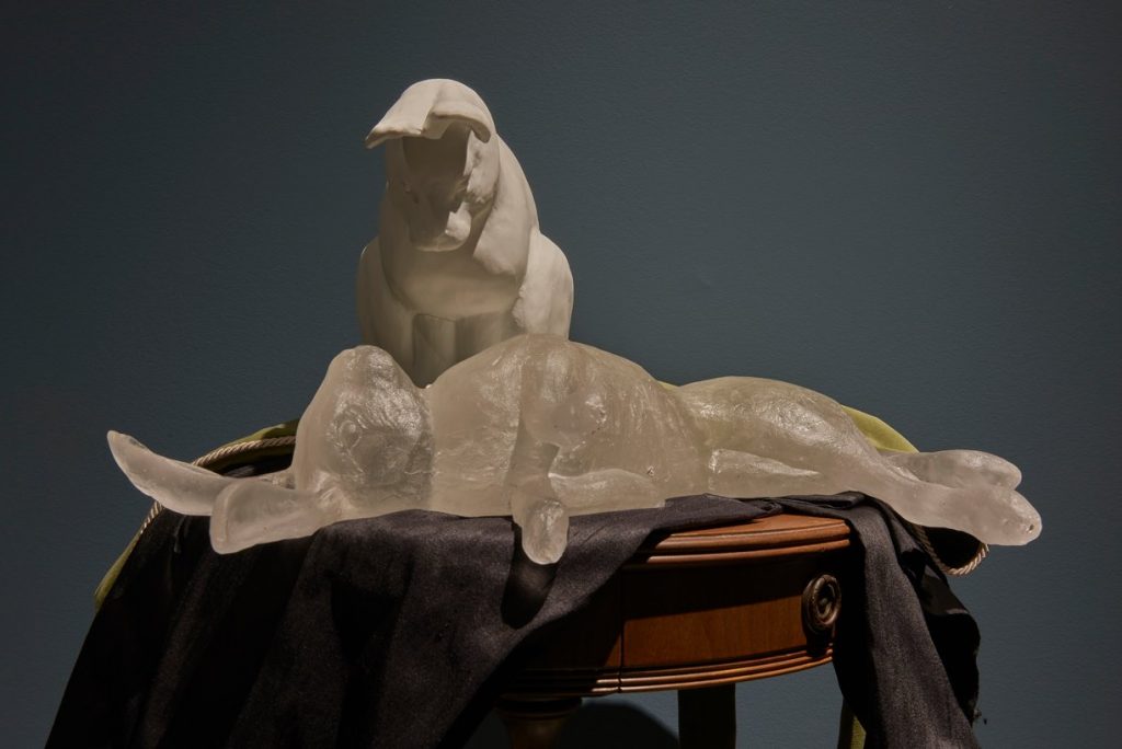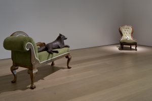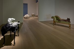 Barkhouse’s polished artworks possess a quiet beauty as they remark on contentious struggles. She takes inspiration for some of her sculptures from the still lifes of seventeenth-century Dutch painter Melchior d’Hondecoeter, known for his depictions of woodland animals or birds, both alive and dead, in lush, woodland settings – works exemplary of the era’s decorative and aesthetically appealing renderings of aristocratic excess and celebration of humanity’s dominance over nature. The Baroque influence of d’Hondecoeter’s era and the historic conflict between the natural world and the “civilized” world drives Barkhouse’s work. “Juxtaposing the wild with the wildly opulent,”[1] her dignified sculptures of birds and mammals are staged with elements of the interiors of French and English colonial luxury: the furniture of wealthy colonizers at the time of contact.