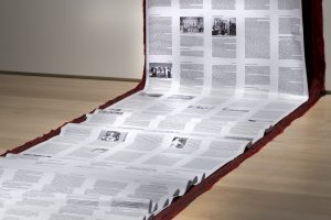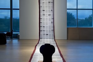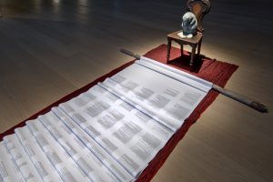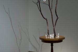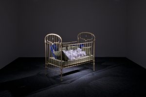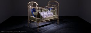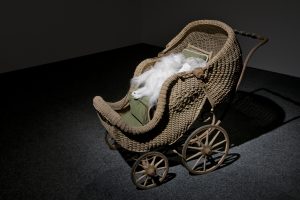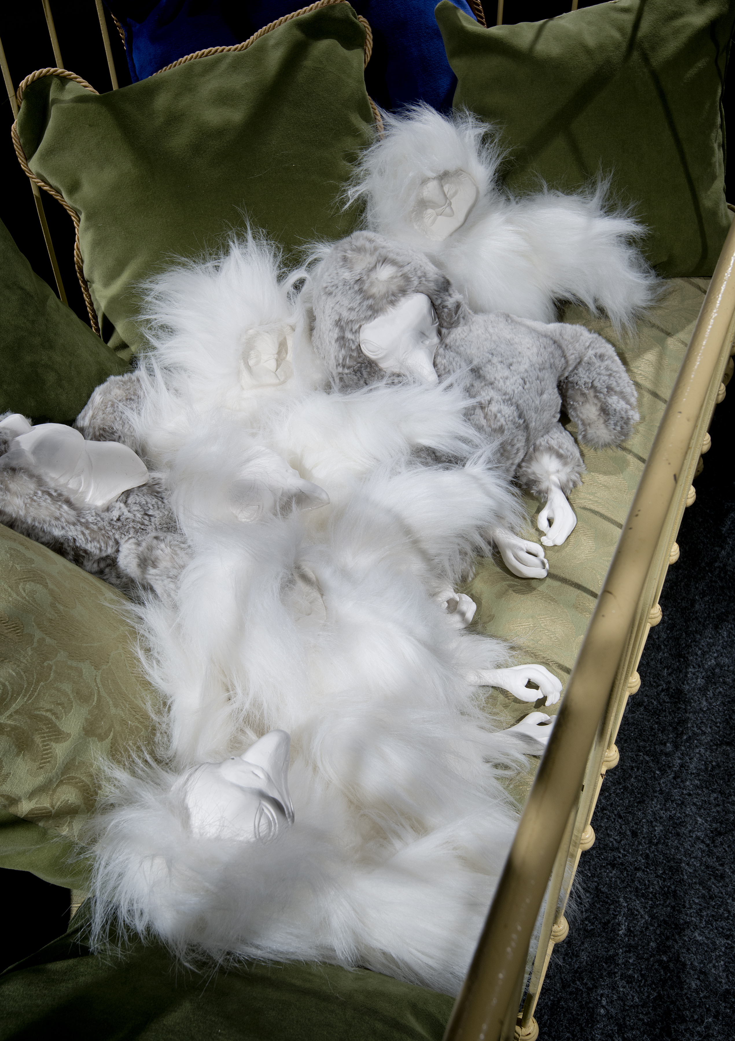 For this exhibition, Barkhouse has expanded the scope of her practice in the creation of three new works that respond to the Truth and Reconciliation Commission (TRC) and the horrific legacy of the Residential School system. Situated in two rooms, Aerie positions baby birds of prey inside of what Barkhouse terms “child containment units”: a Victorian wicker pram and an iron crib. These items of colonial furniture seemingly nurture and offer the birds protection, however, in reality they inflict a betrayal as tools of confinement and control. In this dream-like apparition, the porcelain faces of the baby owl, vulture, and eagle stare up at us. These young birds will mature into strong and powerful creatures, and with the traditional mythological figures of Thunderbird and Raven tucked in beside them, there is the possibility of spiritual hope for the fledglings.