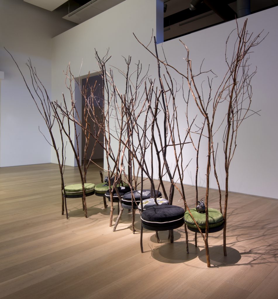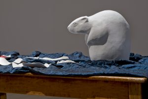 Elsewhere, seven species of the Boreal forest cohabit in an ideal vision of adaptation and survival in the installation, Empire. Despite their differences, they live comfortably together in a large, contiguous habitat. In pairs and alliances they hunt, share food, and warn each other of danger in biological equilibrium; a concept we humans have largely lost as the contestations over land and the renegotiation of territory continues in Canada. With Treaties in dispute and continued human expansion into farmland and bush, the ability of Indigenous people, animals, and even forests to adapt and adjust is under pressure. Amid tension along boundaries and borders, Empire, along with the other sculptural installations in the exhibition, reminds us of the need for coexistence and resistance against isolation, fragmentation, and alienation.