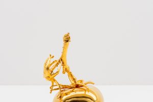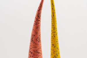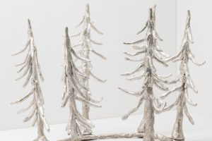 variegata, Taiessa’s ongoing body of work, offers a tangle of plant cuttings that appear to stretch their leaves toward the light in a sun-soaked greenhouse. These plants are crafted from ivory felt, an inert material intended to foil its organic counterpart. Akin to bleached bone, the specific tone of the felt nods to chimeral variegation in a plant’s leaves. This genetic mutation renders a plant unable to uniformly produce chlorophyl – and can also exponentially increase the selling price of a plant cutting.